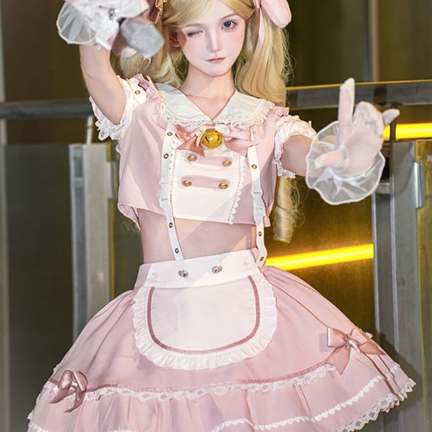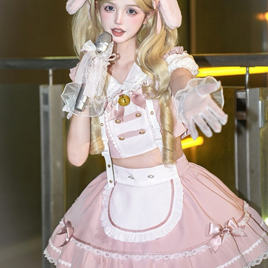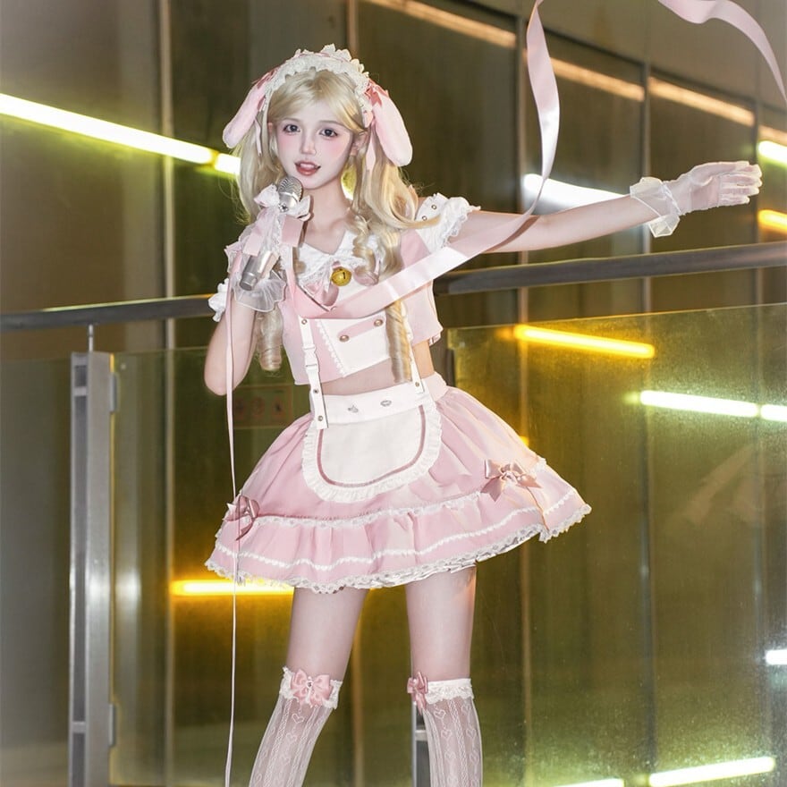 ステージの光を受けて、ふわりと揺れるフリルとリボン。そんな瞬間のために仕立てられたような、甘く華やかなアイドル衣装のセットアップです。胸元の大きなリボンとベルのアクセント、エプロン風のスカートが、舞台や撮影の一瞬一瞬を特別な場面に変えてくれる一着です。