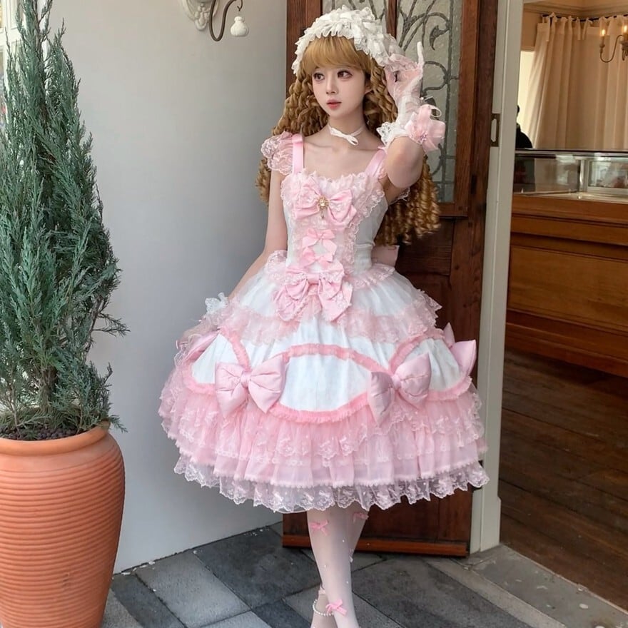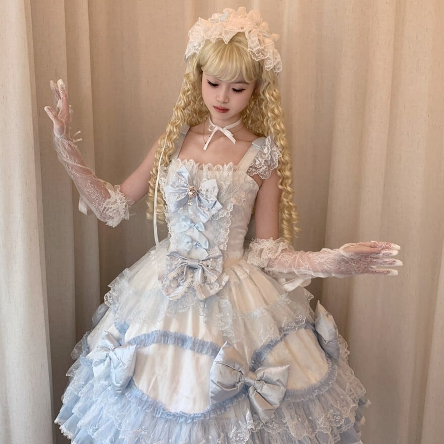 幾重にも重なるレースと、贅沢に配された大きなリボンが視線を引き寄せる------まるで物語の中の少女がそのまま現れたようなジャンパースカートです。淡くやわらかな色彩と立体的な装飾が、纏う人の佇まいに甘く気品ある余韻を残します。