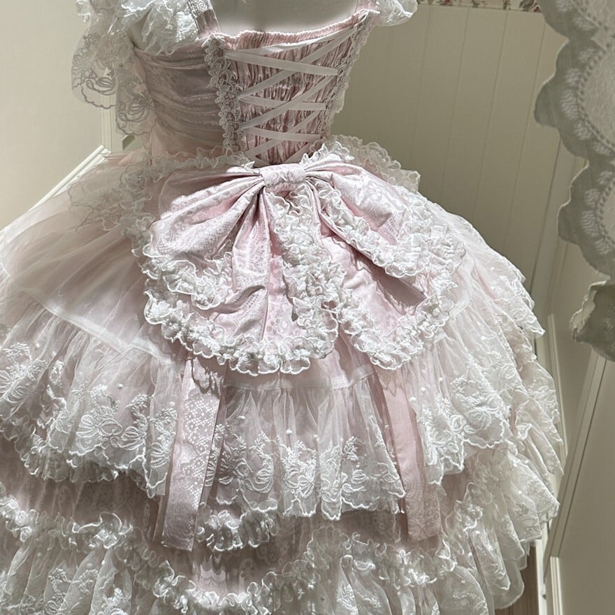 甘ロリ|ふんわり重なるフリルと大きな結びが主役のバックリボン サックス&ピンクの夢見る後ろ姿|SEASONZ
