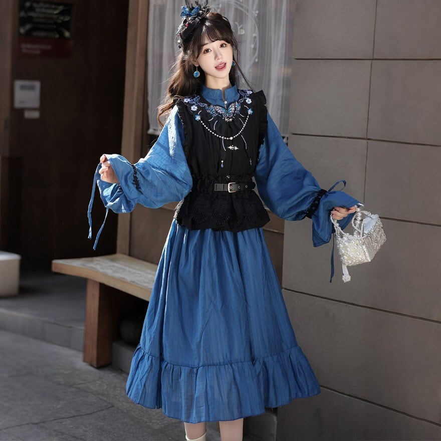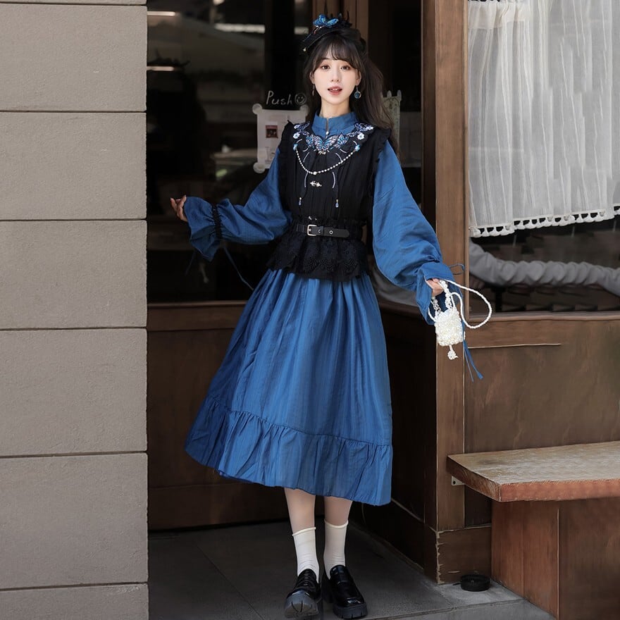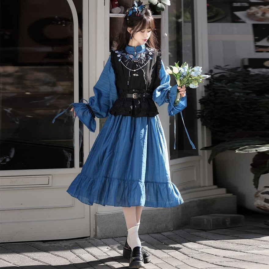 静かな青が揺れるロングワンピースに、刺繍を纏ったベストを重ねた瞬間——それまでの日常がふっと遠のく。中華意匠の気配を残しながら、ロリータの層を重ねた4点セットは、佇むだけで空気を変える存在感を宿しています。