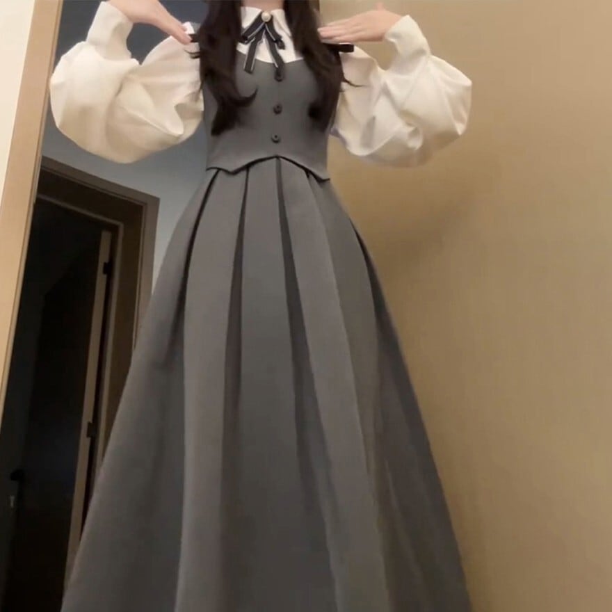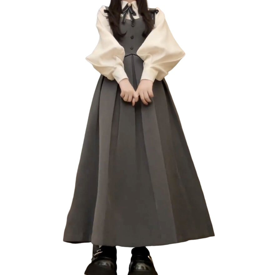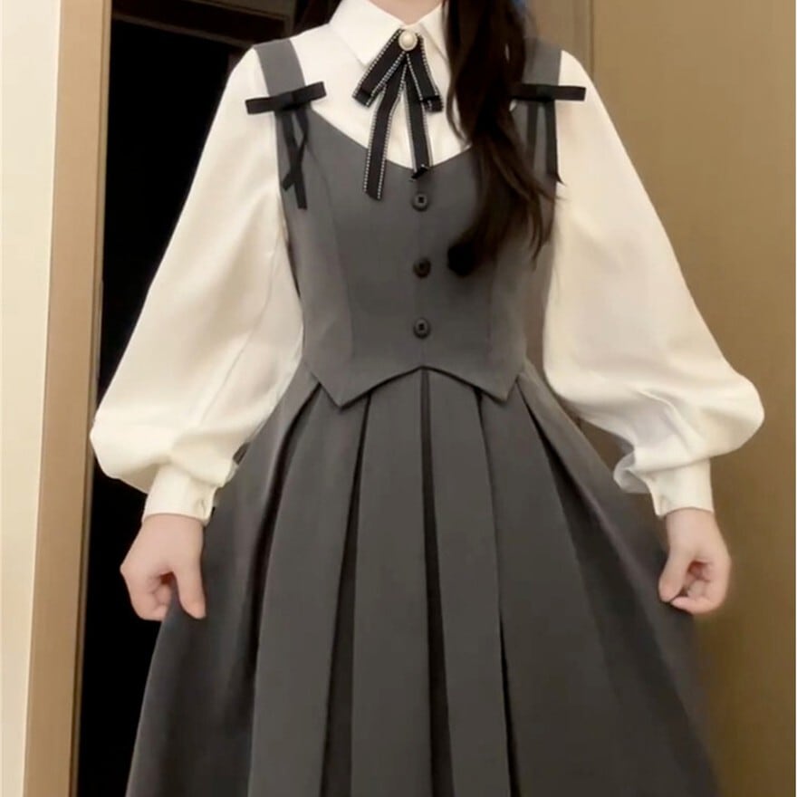 ・ジャンパースカート:落ち着いたグレーカラー。フロントにボタンを配したベスト風の身頃と、規則正しく並んだプリーツスカートがクラシックな印象を与えます。