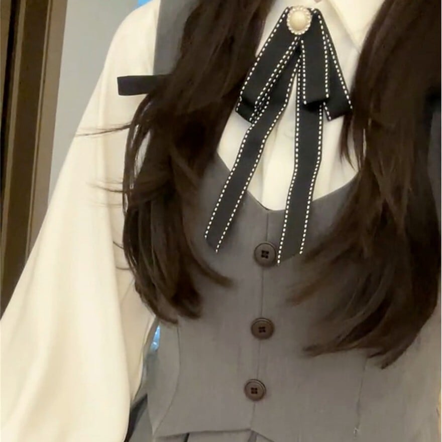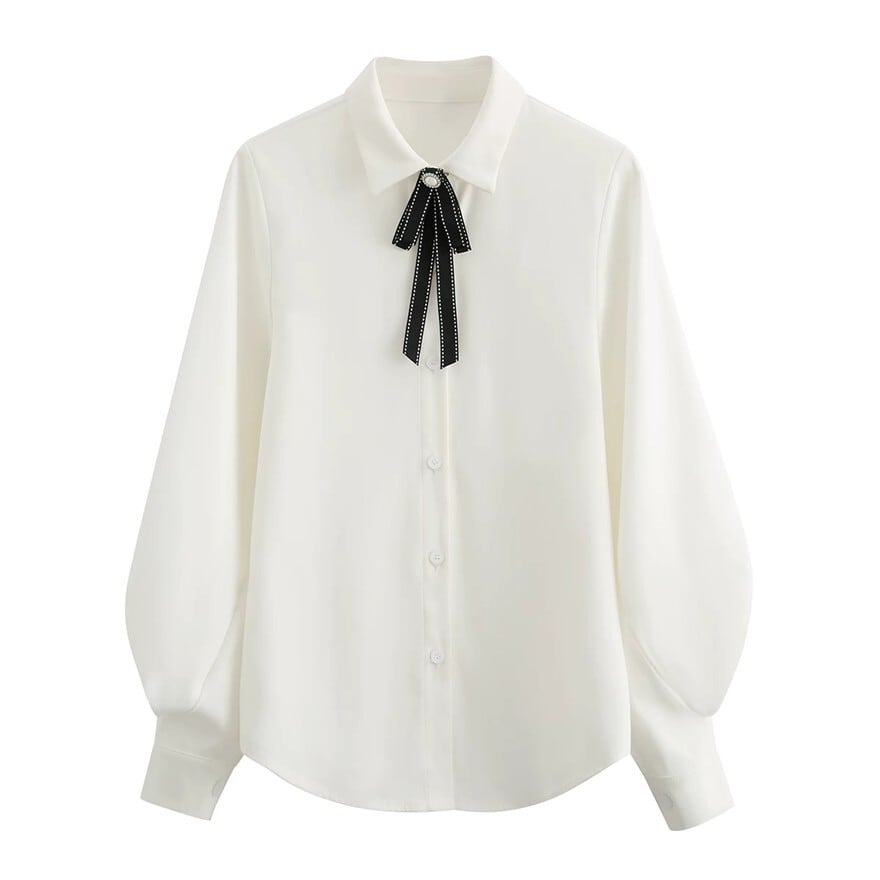 ・ブラウス:清潔感のあるホワイト。大きく膨らんだパフスリーブが特徴的で、手首のボタンでシルエットを際立たせています。襟元にはブラックのボウタイリボンが付属。