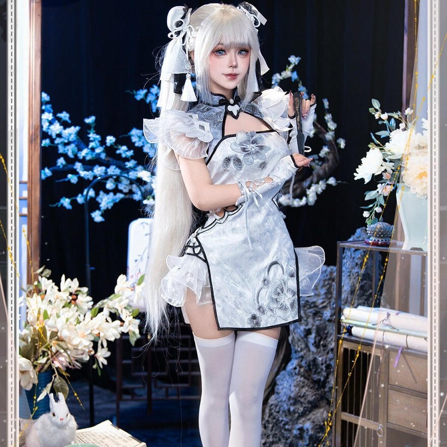 銀糸の花刺繍が施されたチャイナドレス風ワンピースを中心とした、豪華9点のフルセットです。ヘアアクセサリーから腰飾り、ソックスまで揃っており、一着で完成度の高い中華ロリータスタイルを楽しめます。撮影会やステージ、コンカフェ制服としても最適な、気品溢れるデザインです。