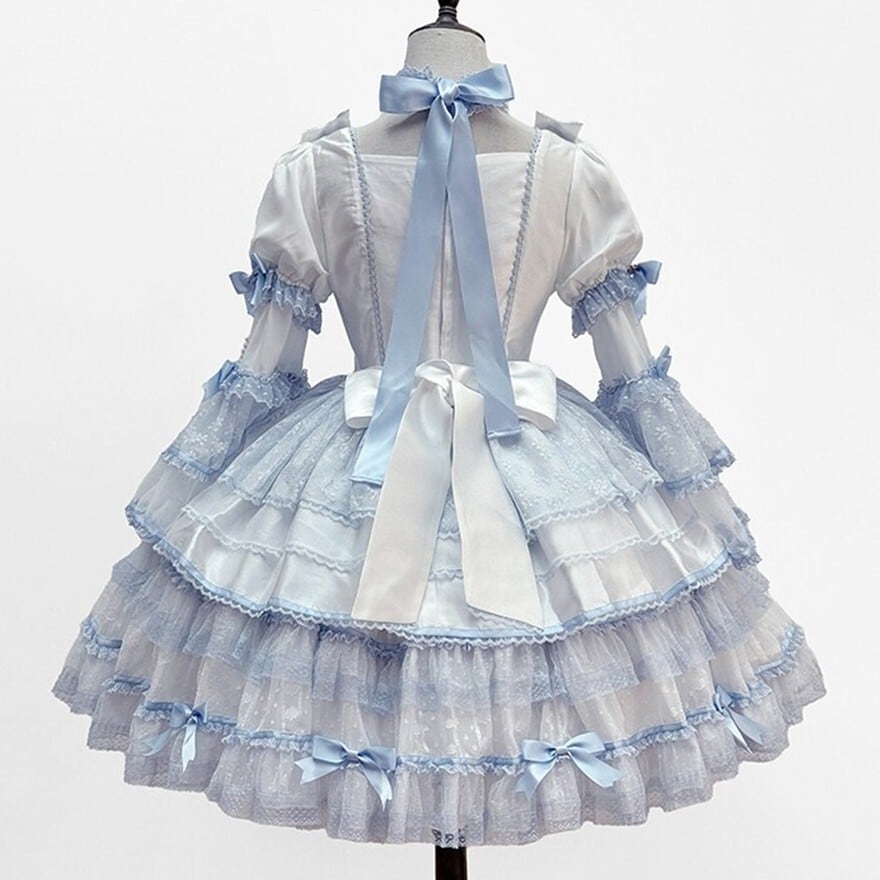 ピンク、ブラック、ブルー、ミントグリーンの4色展開となる、お人形風パフスリーブワンピースです。大きなバックリボンと繊細なレース、フリルが特徴の甘ロリスタイルで、撮影会やロリータイベントでの着用に適した、少女の夢を形にした一着です。