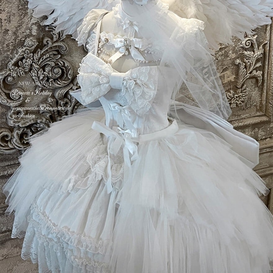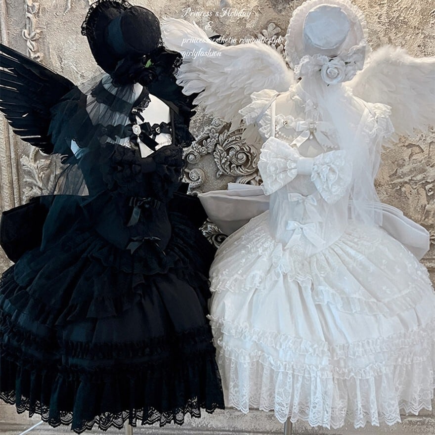 ゴシックという美学は、常に「闇の中に咲く花」を求めてきた。退廃と気品が同居するこの衣装は、その答えのひとつです。夜の帳に溶け込むブラック、そして静寂の光を纏うホワイト。対照的な2つの色が、それぞれの孤独と高潔さを紡ぎ出します。