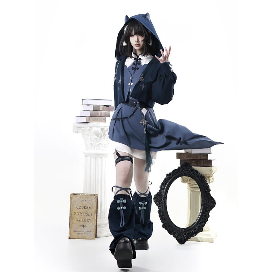 夜の静寂を思わせるネイビーに、意志の強さを象徴するホワイトのアクセント。鎖の冷たさと猫耳の愛らしさが、ぎりぎりの均衡で共鳴するパンクスタイルのセットアップです。トップスからレッグウォーマーまで、計算されたシルエットが纏う人の佇まいを鋭く、そして自由に変えていきます。