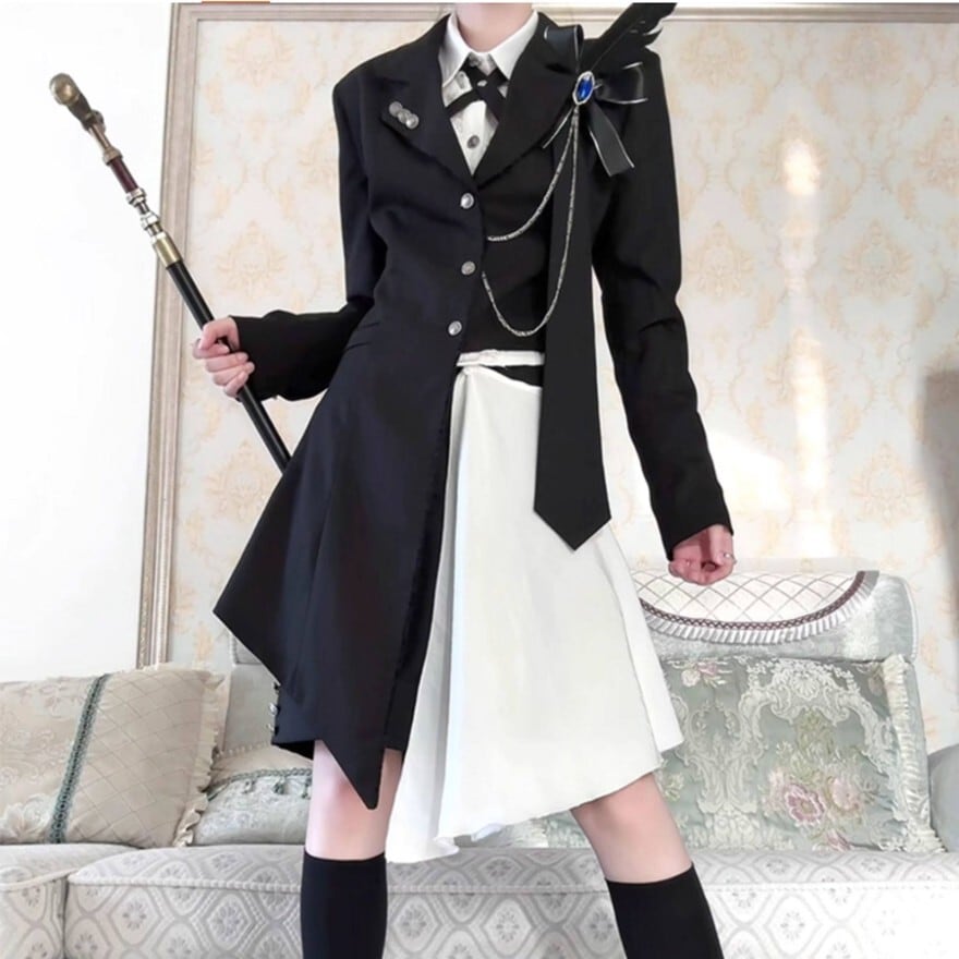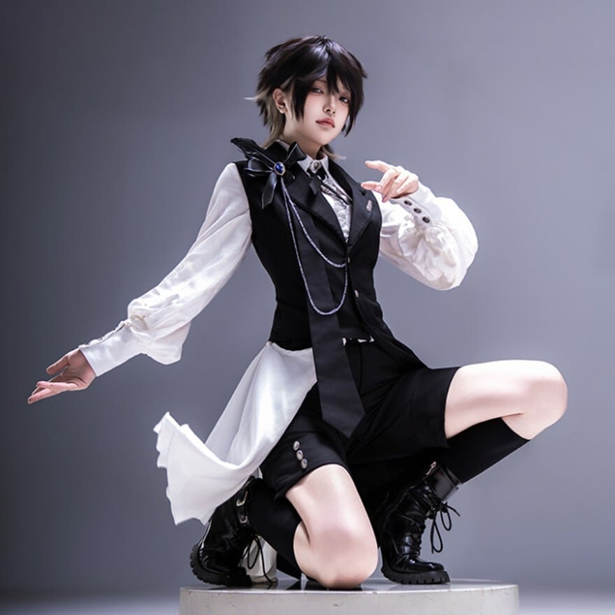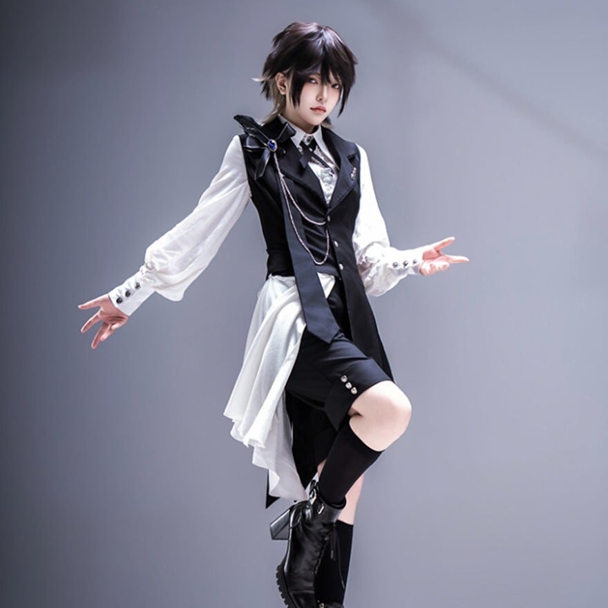 物語の幕が上がる瞬間、スポットライトを浴びる主人公のような佇まい。モノトーンのコントラストが美しい燕尾ベストとハーフパンツを軸にした、王子系少年装の豪華8点セットです。アシンメトリーな裾のラインと、ディテールまで作り込まれた装飾が、特別な日の自分をより鮮明に描き出します。