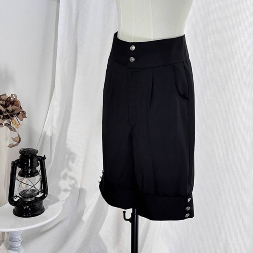 ・ ボトムス:ブラック、膝丈ハーフパンツ、サイドボタン装飾