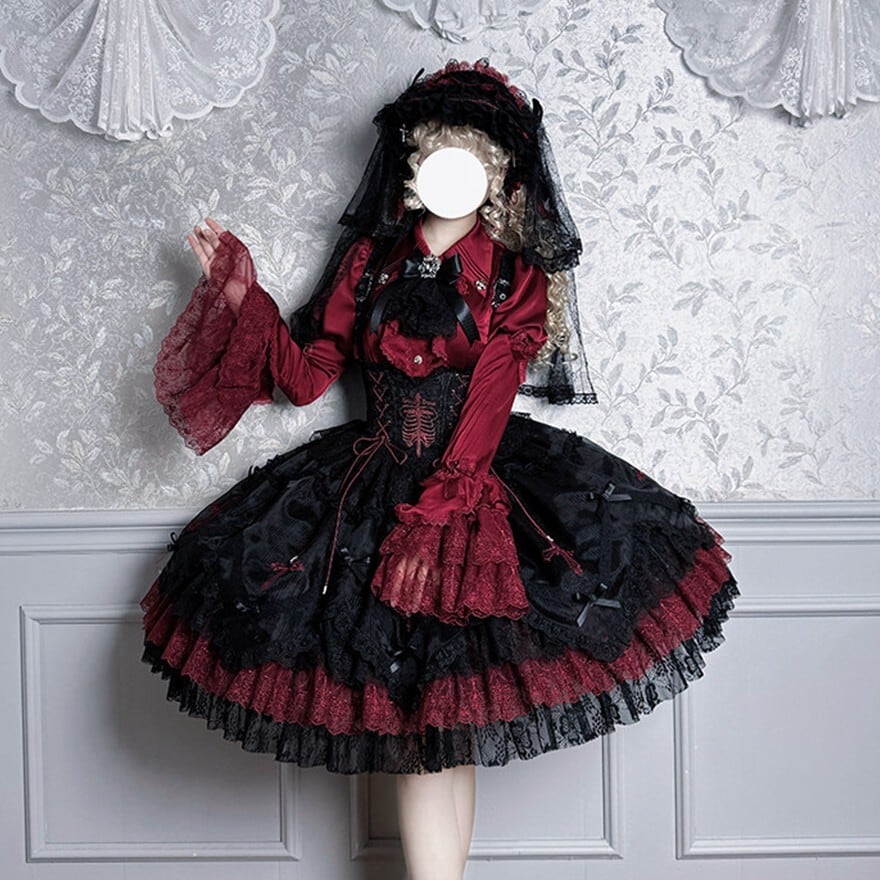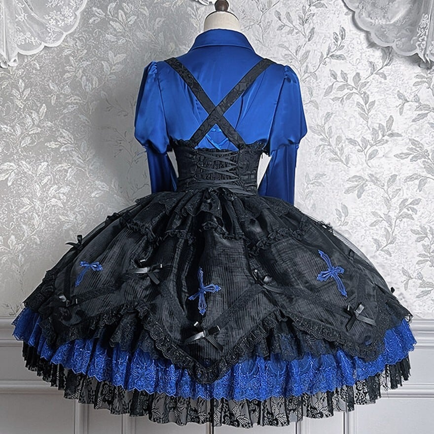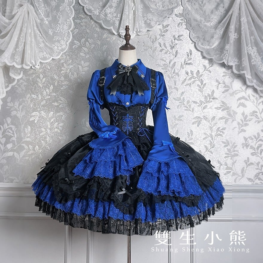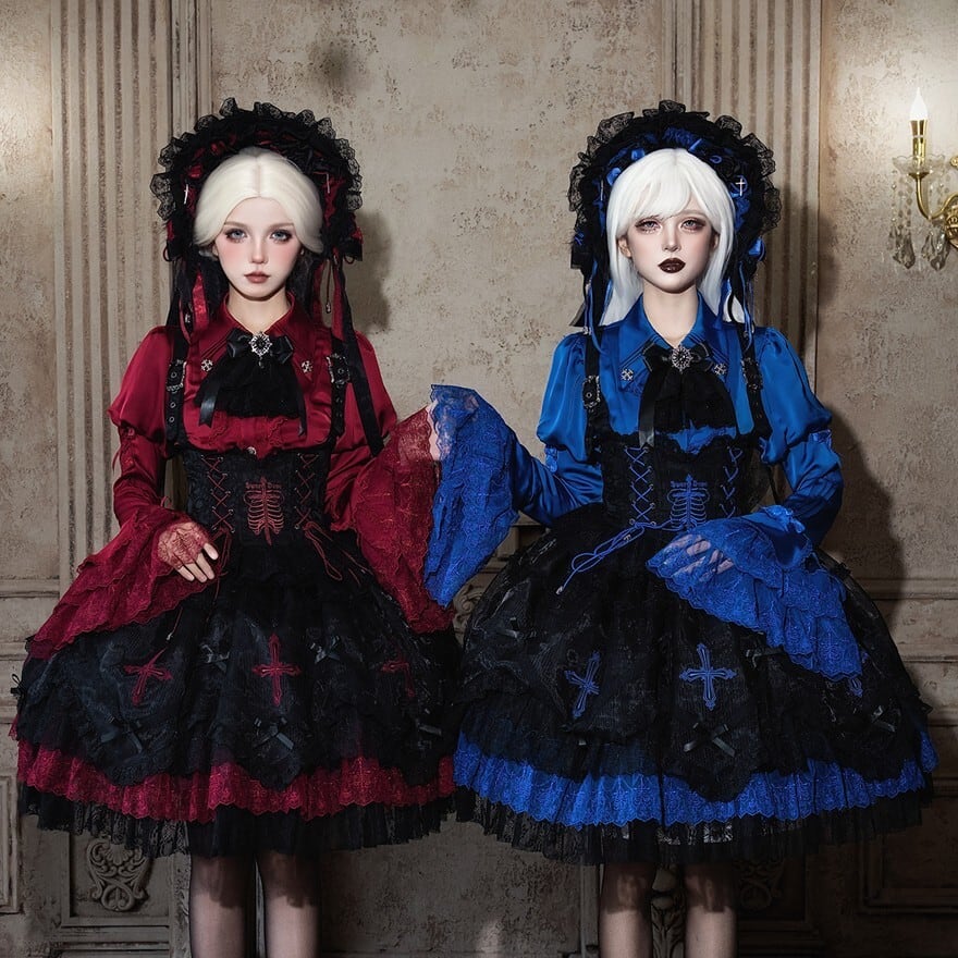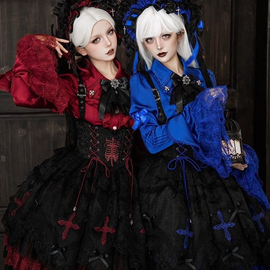 ゴスロリジャンルの姫袖ブラウスとジャンパースカートのセットアップです。ブルー×ブラック、レッド×ブラック、ブラック×ブラックの3色展開で、フリルと編み上げデザインが特徴。コンカフェ制服や双子コーデ、ステージ衣装に適した一着です。