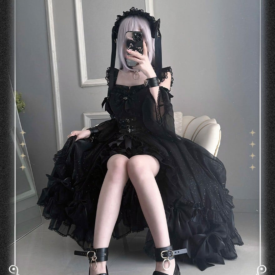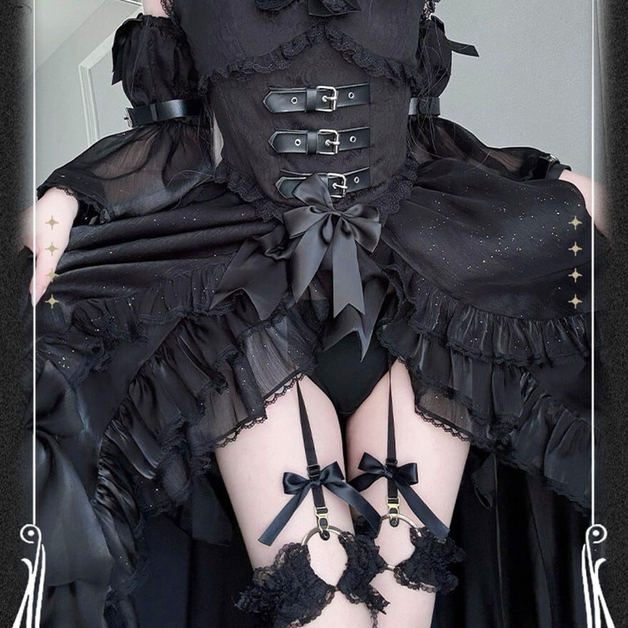 コルセットデザインのトップス、ボリュームのあるフリルスカート、付け袖、カチューシャ、ガーターリングが揃った豪華5点セットです。漆黒の生地に散りばめられた星空のようなグリッターと、ハードなベルト装飾が融合した退廃的なゴシックスタイルを演出します。