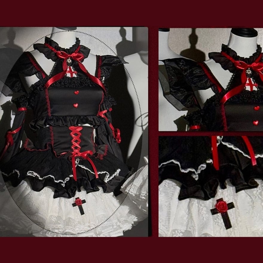 十字架刺繍と赤い編み上げリボンが特徴の地雷系ゴシック5点セット。トップス、スカート、取り外し袖、ヘアクリップ、リボンブローチが揃い、これ一着で完成度の高い地雷系・ゴシックコーデが楽しめます。ライブ衣装、撮影会、コンカフェ制服、双子コーデに最適なデコラティブで華やかなデザインです。