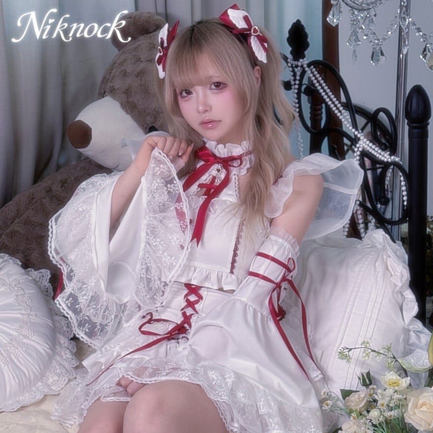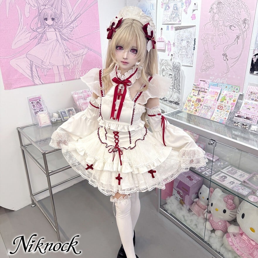 純真さと危うさを兼ね備えた白と黒。胸元の赤リボンと裾に並ぶ十字架が、地雷系・ゴシック特有の世界観を鮮烈に描き出します。取り外し可能な袖やヘアクリップまで揃った贅沢な5点セットで、着る瞬間から特別な物語の主人公になれます。双子コーデとして並べれば、圧倒的な美意識を演出できます。