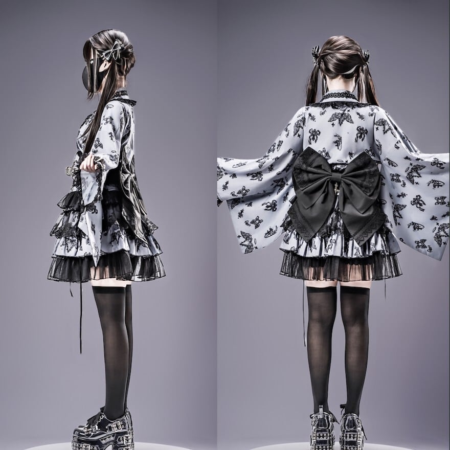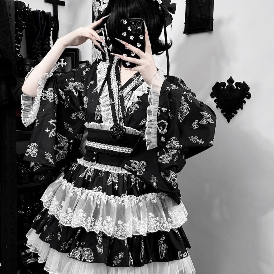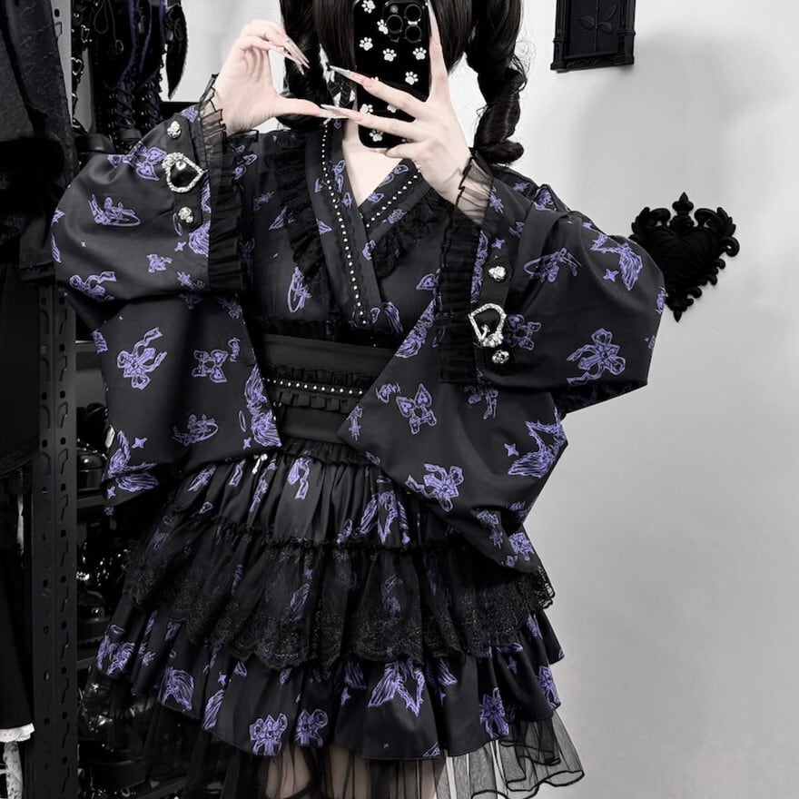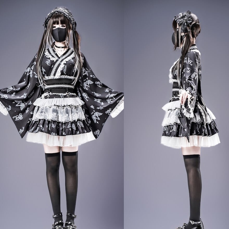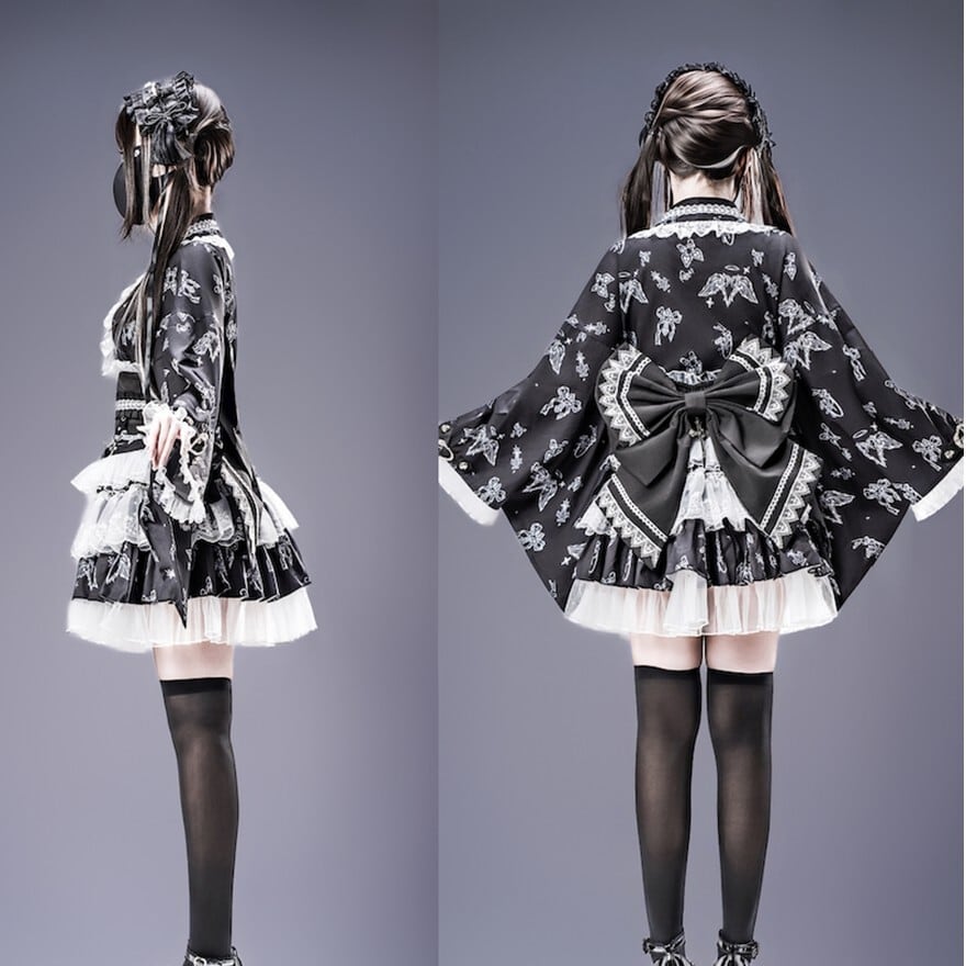 和ロリータスタイルのセットアップです。天使やリボンのダークな総柄が施された羽織と、多層ティアードスカートの2点セットで、ブラック×ホワイト、ブラック×パープル、ブルーグレーの3色展開です。コンカフェ制服や撮影会衣装として、和のシルエットと地雷系・ゴシック要素を融合させた独自の世界観を表現できます。