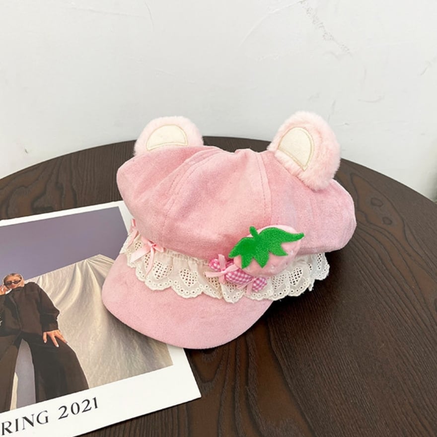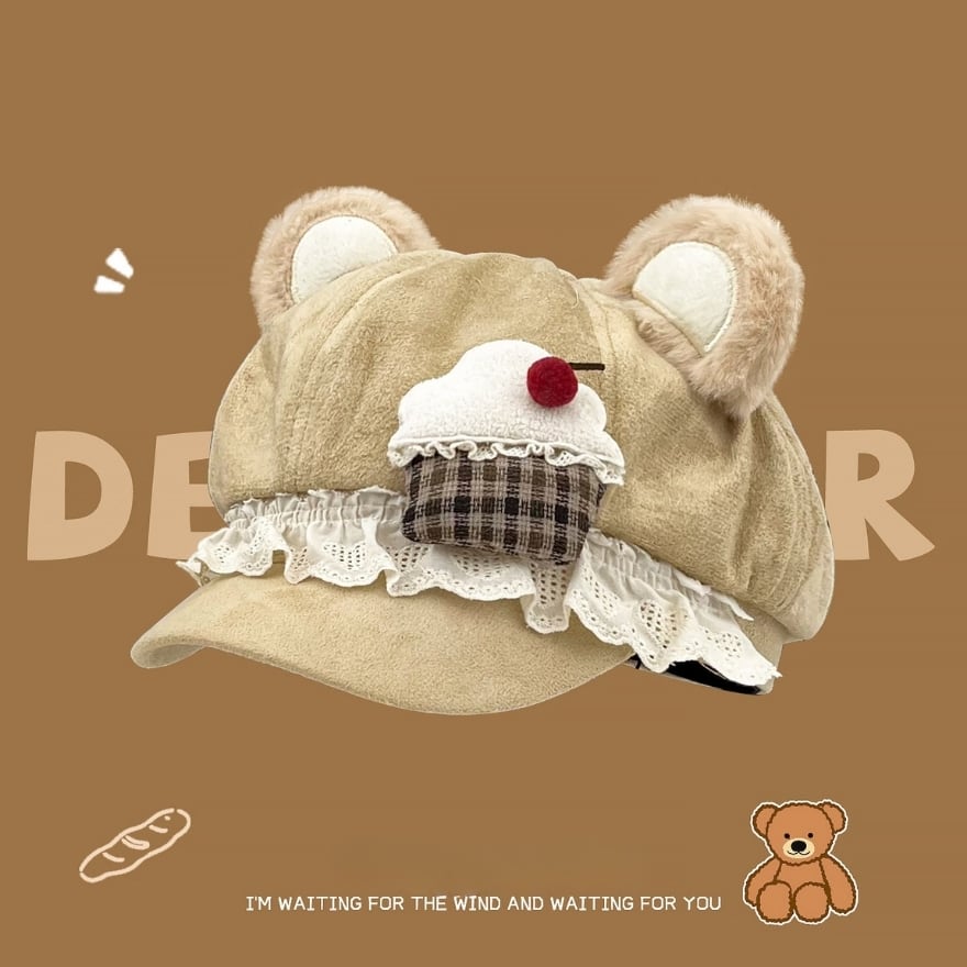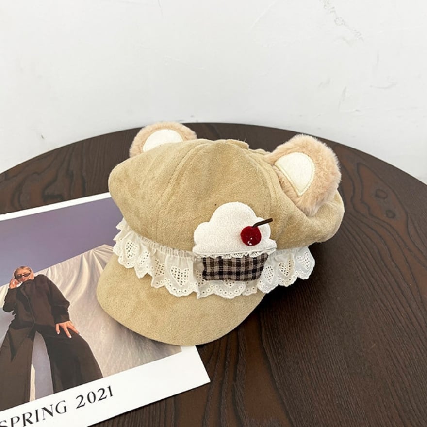 くま耳の丸みとレースのやわらかさが重なり、装い全体に甘い余韻を残してくれます。