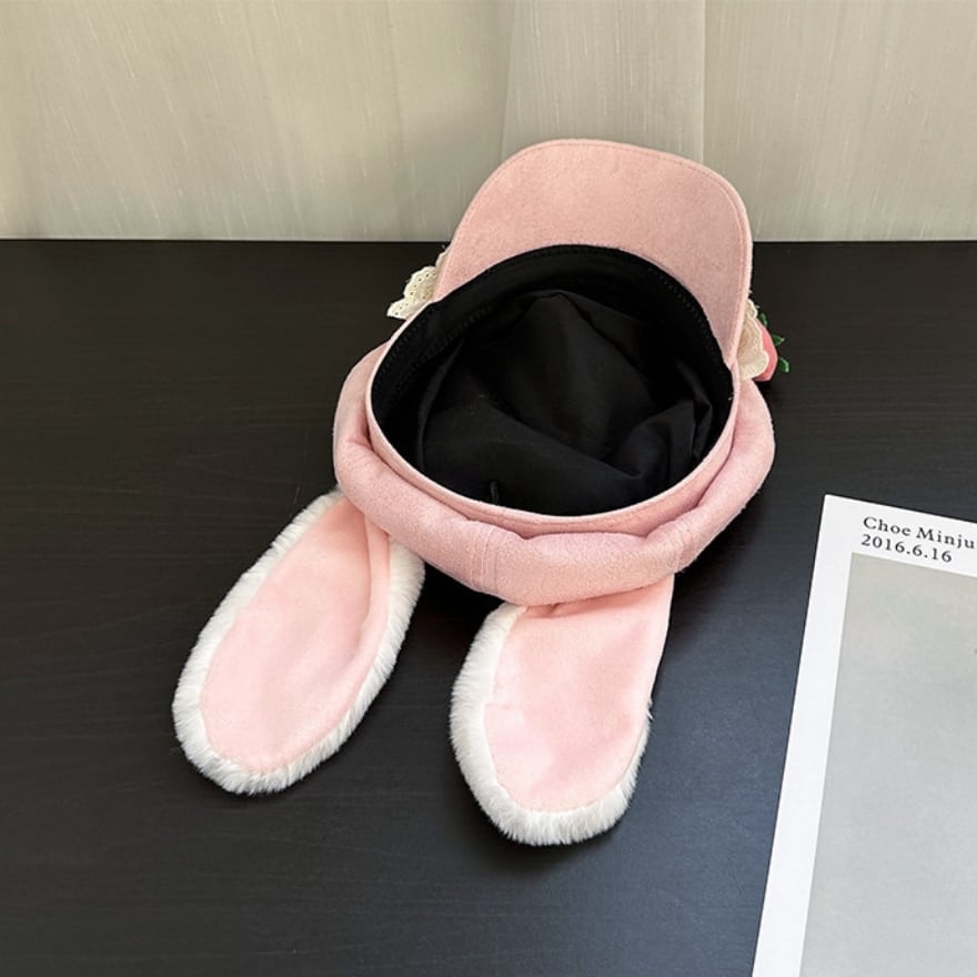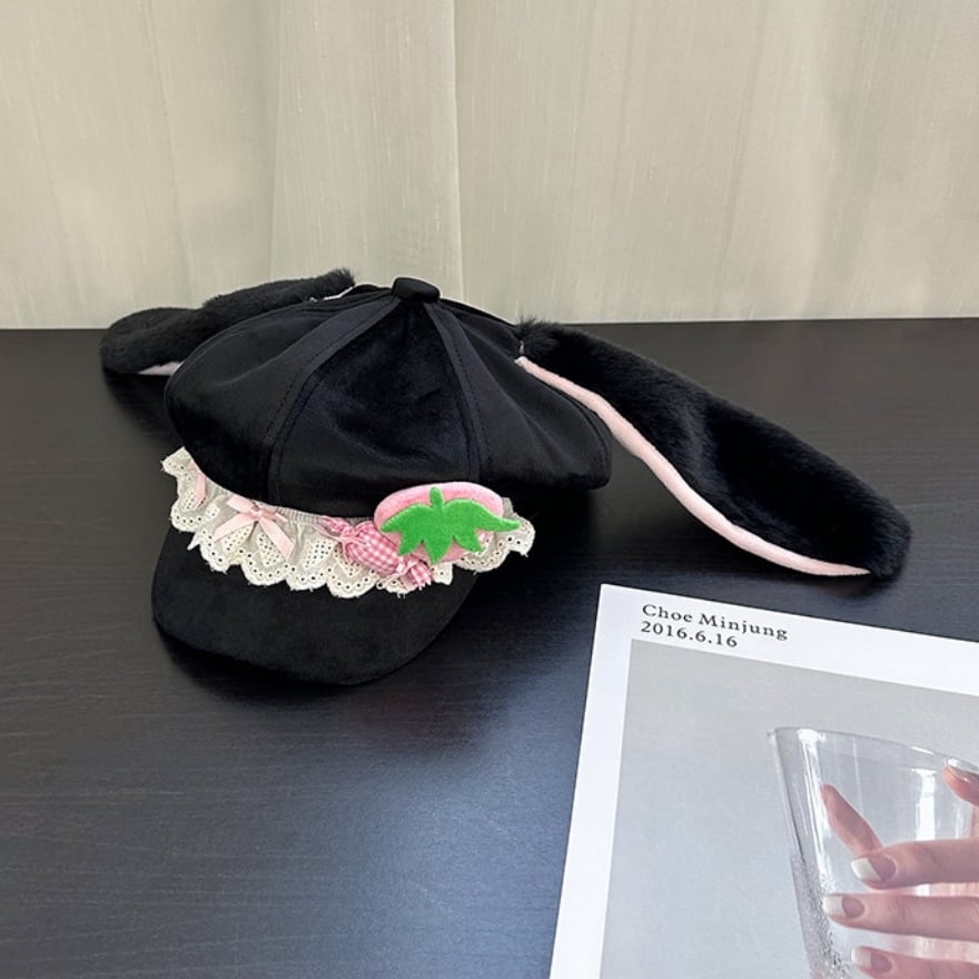 いつものコーデに少しだけ甘さと違和感を差し込みたい日に選びたくなる、うさ耳付きのレースキャップです。苺モチーフと小さなリボン、やわらかな耳のシルエットが重なり、ラフな帽子でありながら印象はしっかり残してくれます。