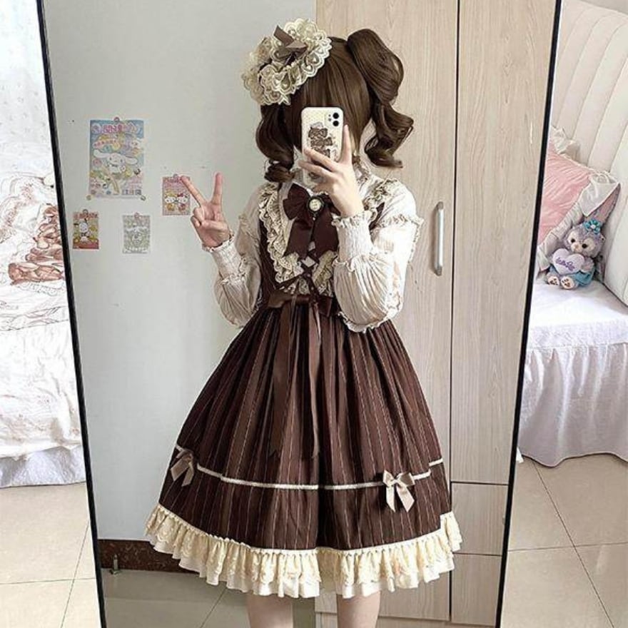 クラシカルロリータの魅力は、甘さを抑えながらも、細部に宿る優雅さで心を惹きつけるところにあります。ブラウンの落ち着きに生成色のやわらかなフリルが重なることで、アンティークのティールームに似合う静謐な美しさが生まれます。飾り立てるのではなく、佇まいそのものを美しく見せてくれる装いです。