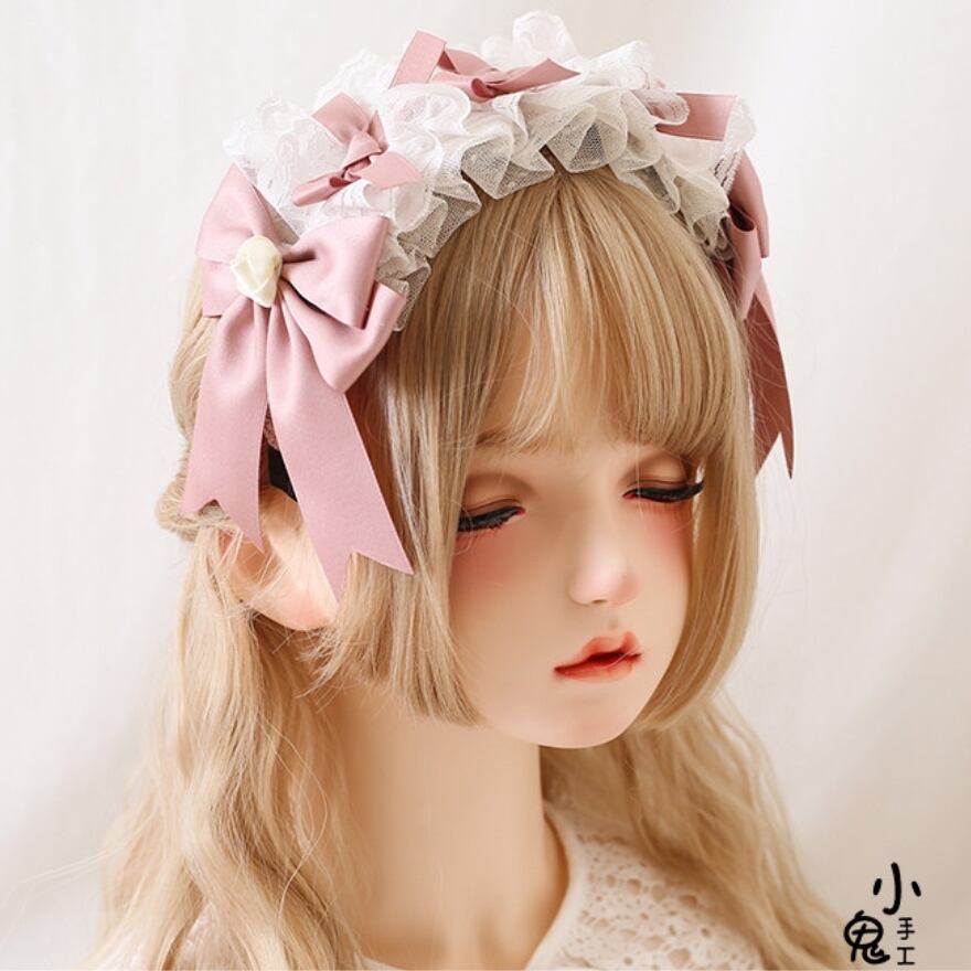 クラシカルロリータの美しさは、甘さをそのまま見せるのではなく、整えられた装飾の中に静かな気品を宿せるところにあると思います。白いレースに淡いピンクを差し込むことで、アンティークのドレッサーにそっと飾られたリボンのような、穏やかでやさしい空気が生まれます。可憐さの中にも品のある余韻を残したい日に選びたくなるヘッドドレスです。
