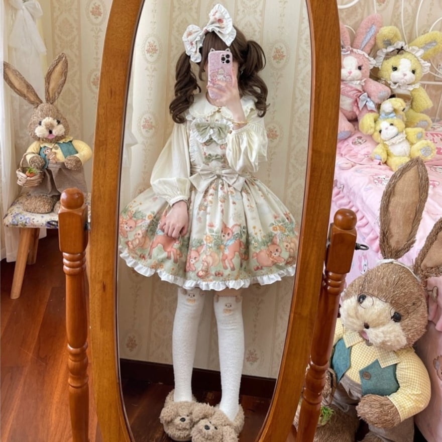 甘ロリの魅力は、ただ可愛いだけではなく、心をほどくようなやわらかな夢を纏えるところにあると思います。森の動物たちと花々がアイボリーの中で静かに寄り添うことで、どこか懐かしく、やさしい時間が生まれます。お茶会や撮影会の日を、絵本の一頁のように見せてくれるワンピースです。