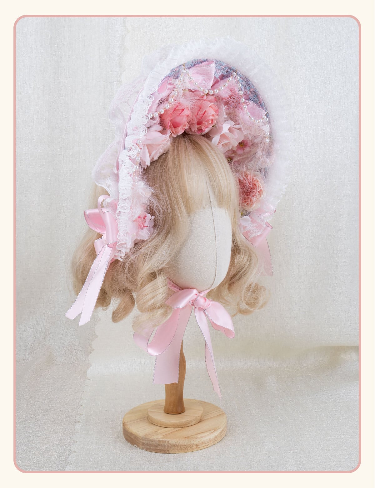 花々とレースをたっぷり重ねた、物語のような華やかさを纏えるロリィタボンネットです。やわらかなピンクと生成色の彩りに、リボンやパール調の装飾が寄り添い、顔まわりへ可憐さと上品な甘さを添えてくれます。お茶会や撮影会で、装い全体を印象的に整えてくれる主役級のヘッドアクセです。