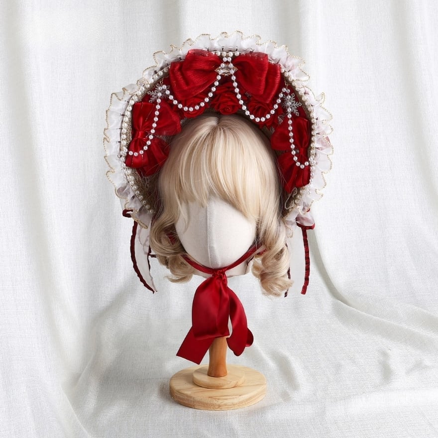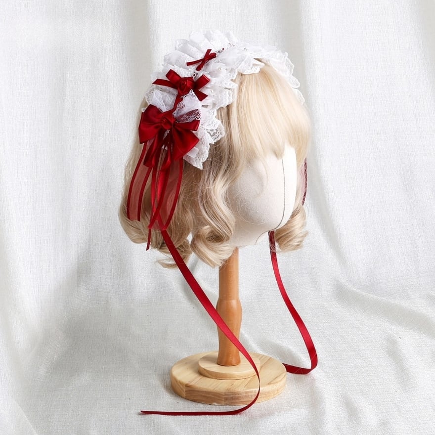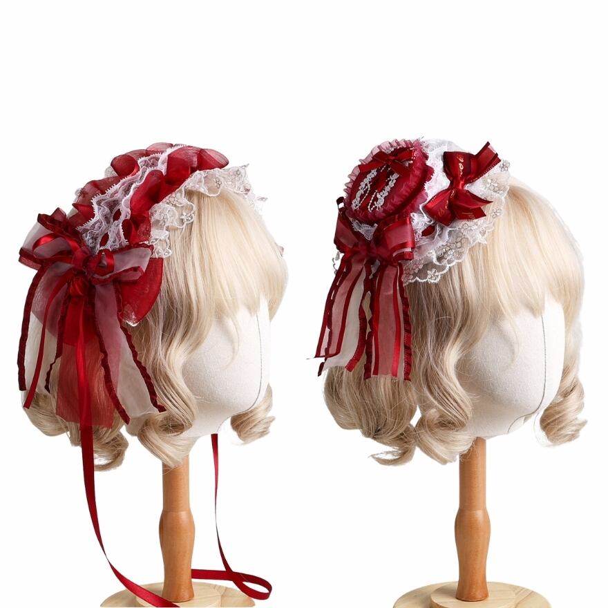 艶のある赤いリボンを主役にした、顔まわりへ可憐な華やぎを添えるヘアドレスです。白の細リボンやレース調のディテールが重なり、鮮やかさの中にもやわらかな甘さを感じさせます。ロリィタコーデに取り入れるだけで、横顔まで印象的に整えてくれる髪飾りです。