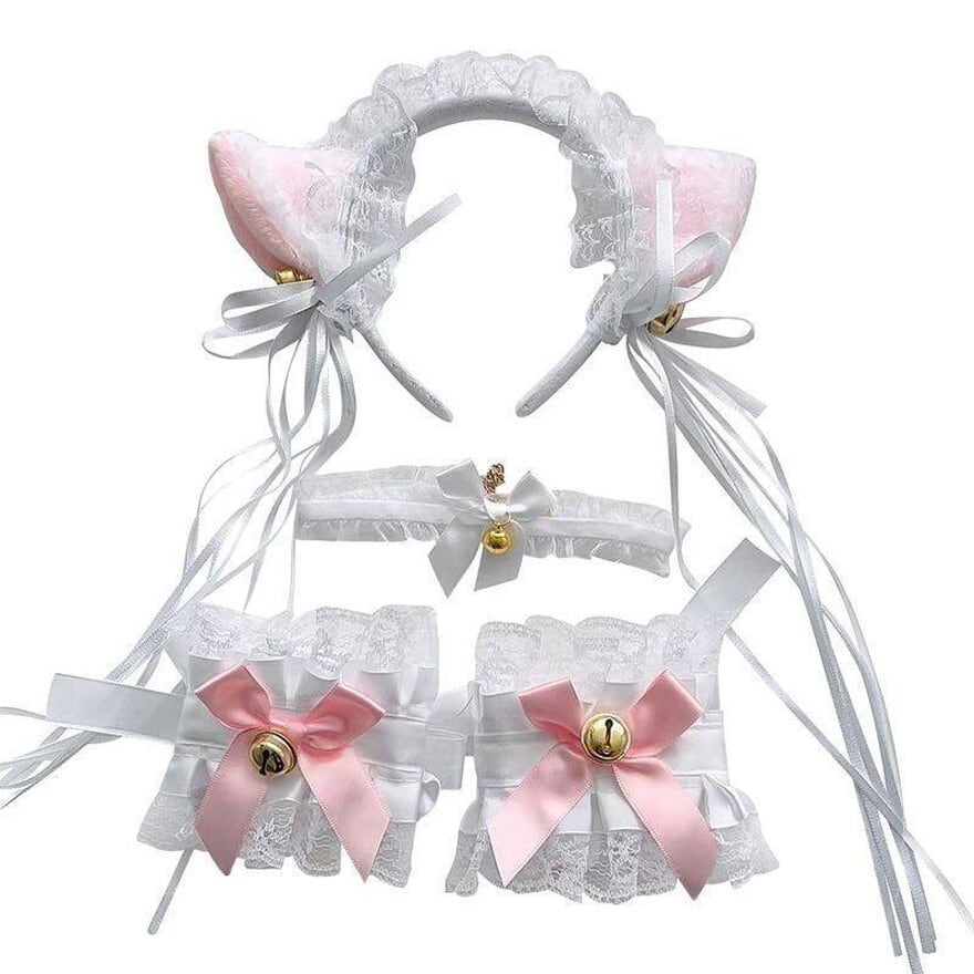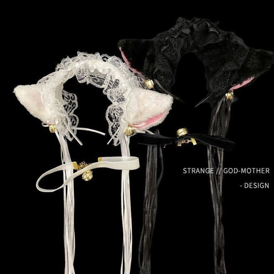 甘さだけでは終わらない、少し気まぐれで視線を誘う佇まい。猫耳という遊び心に、黒レースや白レースの儚さ、細く垂れるリボンの余韻が重なることで、このセットはコーデ全体に物語を足してくれます。主役の装いに添えるだけで、空気の温度まで変わるようなアクセサリーです。