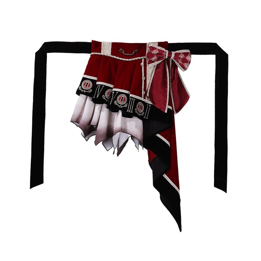 赤と黒のコントラストが際立つアシンメトリースカートと装飾ブラウスのパンクロリータセットで、撮影会やイベント向けに印象的なスタイルを完成させるSEASONZ取り扱いのアイテム。