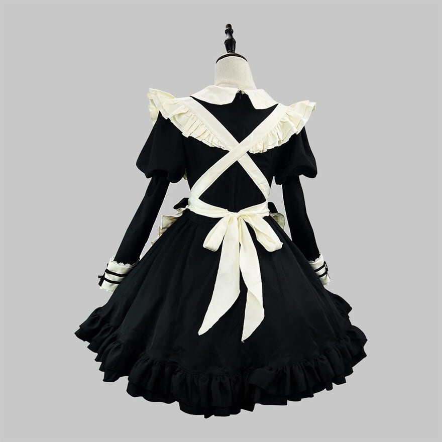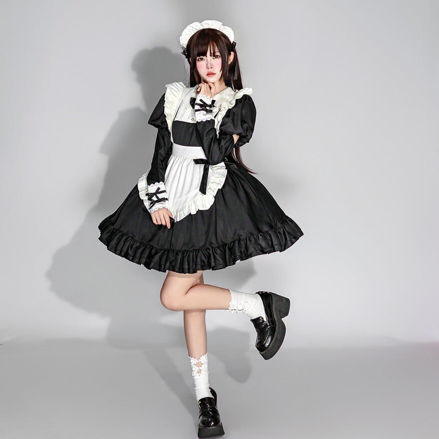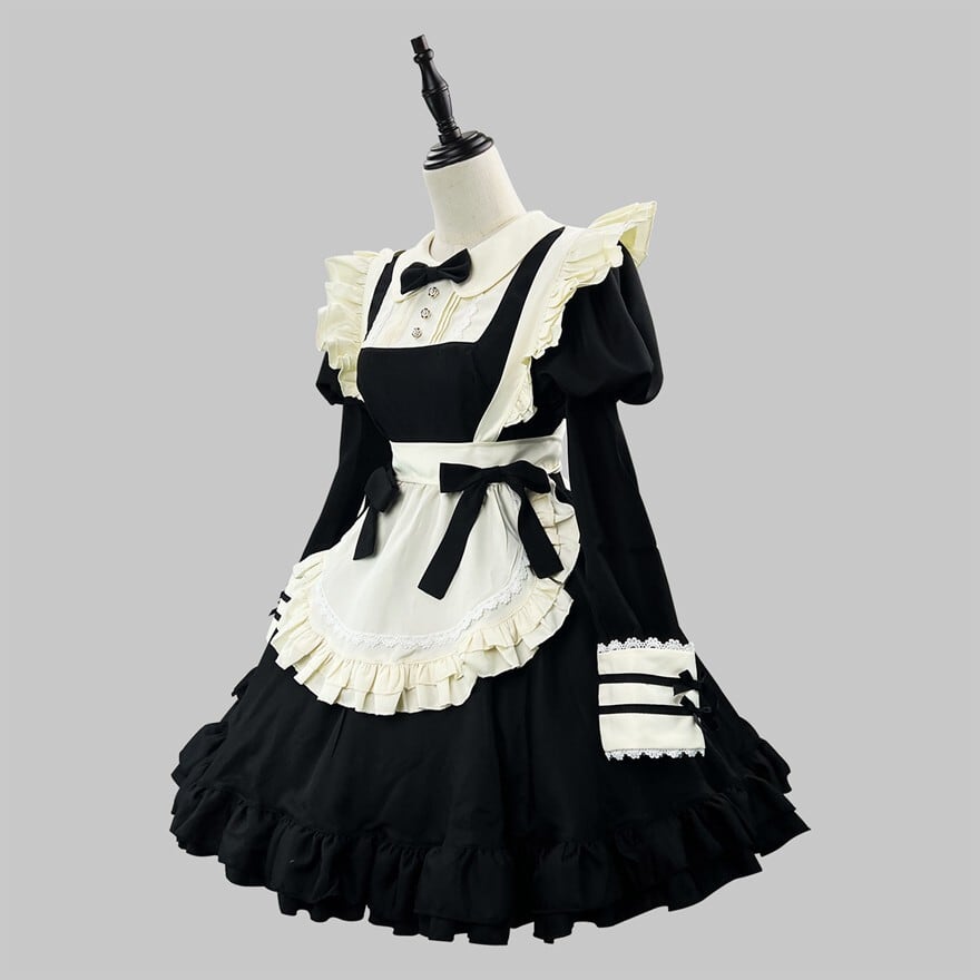 軽やかに広がるミニ丈のシルエットに、白いフリルエプロンが重なることで、動きの中に可憐さと整った印象が生まれる一着です。胸元のリボンや袖口のディテールが全体を引き締め、黒と白の対比が輪郭を際立たせます。コンカフェや撮影の場で、軽快さとクラシカルな空気を同時に纏えます。