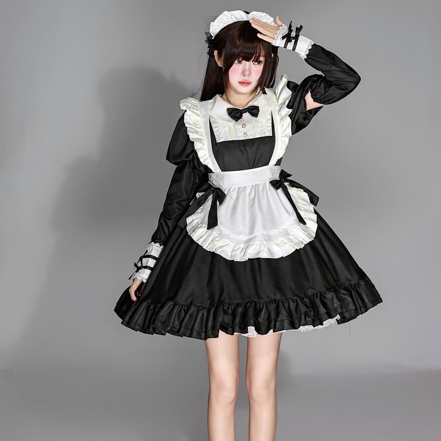 清潔感と規律を基盤にしながら、軽やかな丈感で動きを強調したメイドスタイル。整えられたフリルとリボンが、非日常の空間に自然なリズムを生み出し、場の空気をやわらかく変えていく。