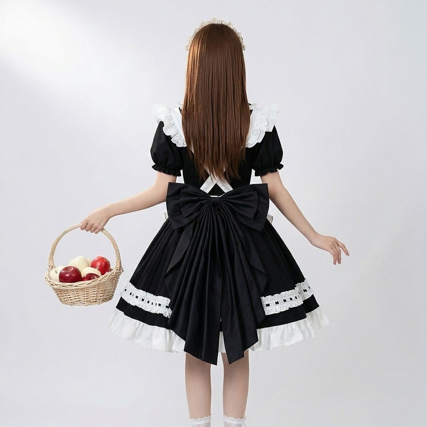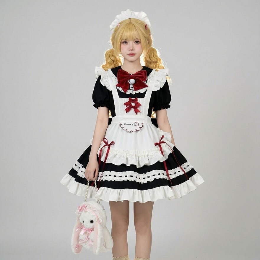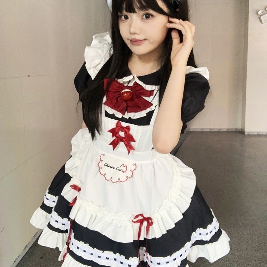 黒を基調としたドレスに白いフリルエプロンと赤リボンが重なり、整った甘さの中に印象的なアクセントが宿る一着です。胸元の大きなリボンとエプロンの装飾が視線を引き寄せ、裾のフリルが軽やかな動きを生みます。コンカフェや撮影の場で、可憐さと存在感を同時に纏えます。