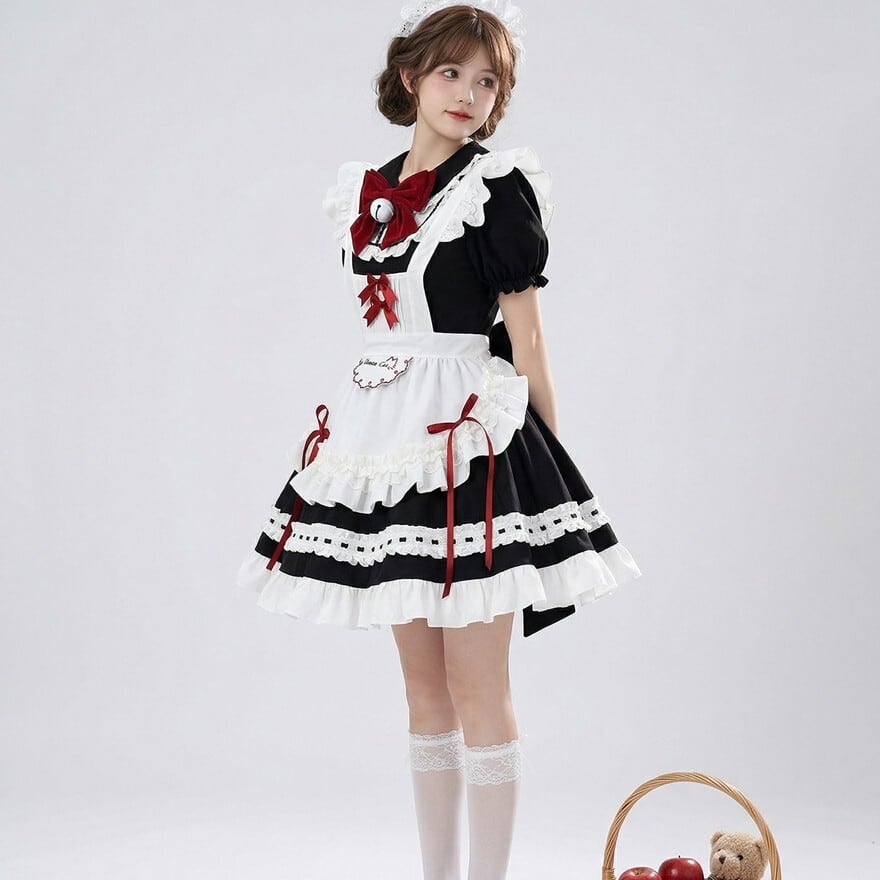・装飾:胸元に大きなレッドリボン、エプロンに小リボンディテール