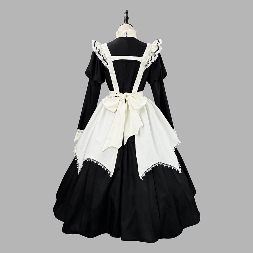 静けさを帯びた黒に白のフリルが重なり、凛とした佇まいをつくるクラシカルメイドドレスです。ハイネックやレイヤードされたエプロン、クロスモチーフの装飾が全体に統一感を与え、着る人の所作まで整えて見せます。コンカフェや撮影の場で、空間ごと世界観を引き締める一着です。