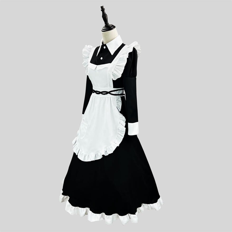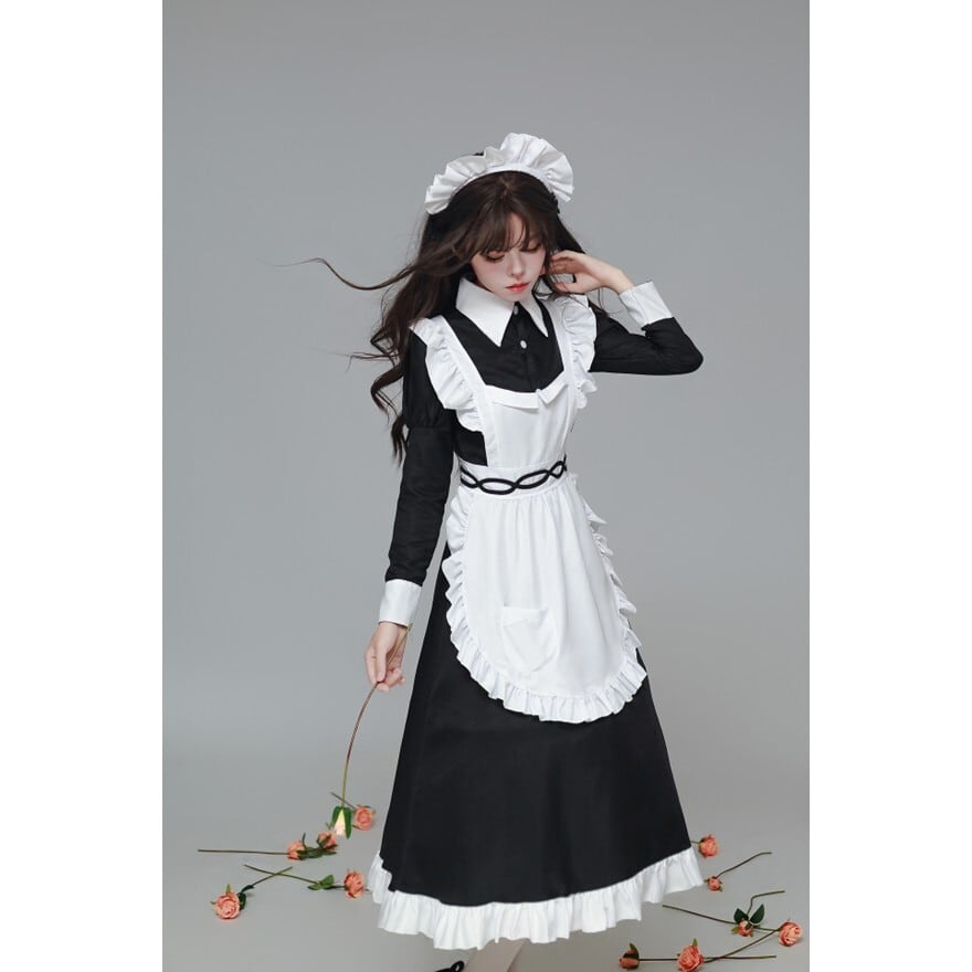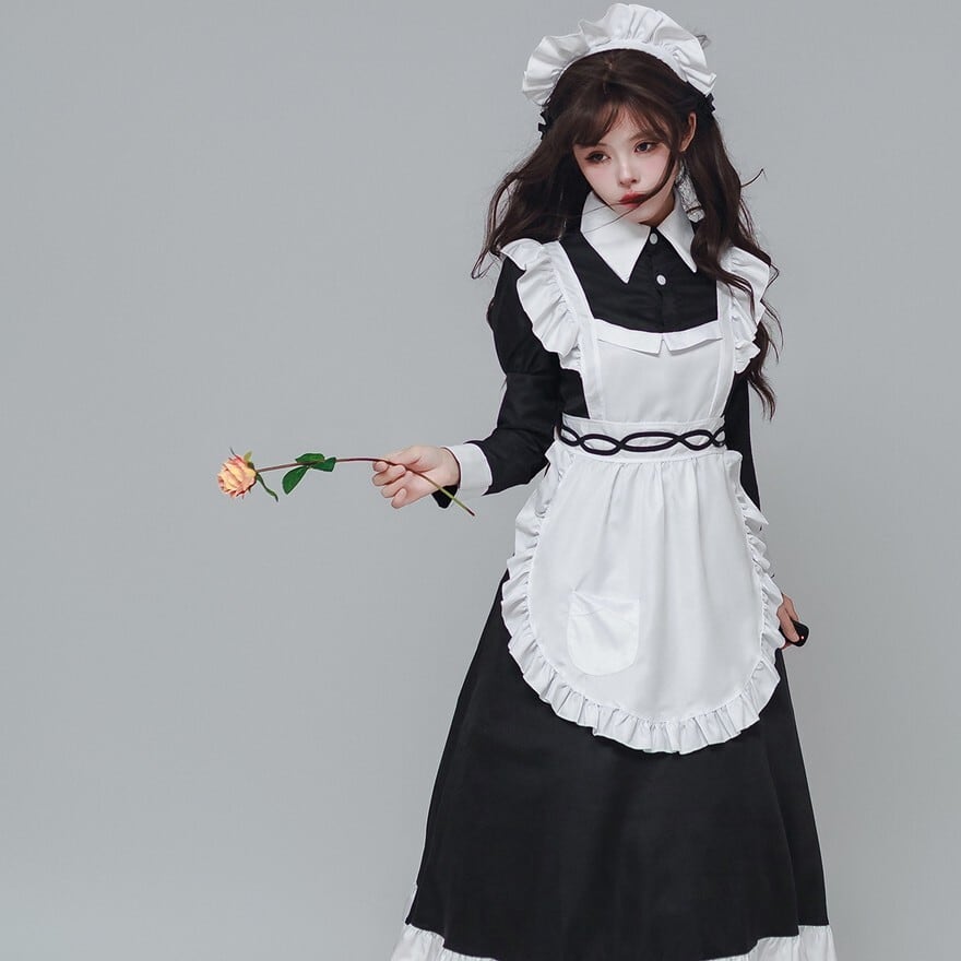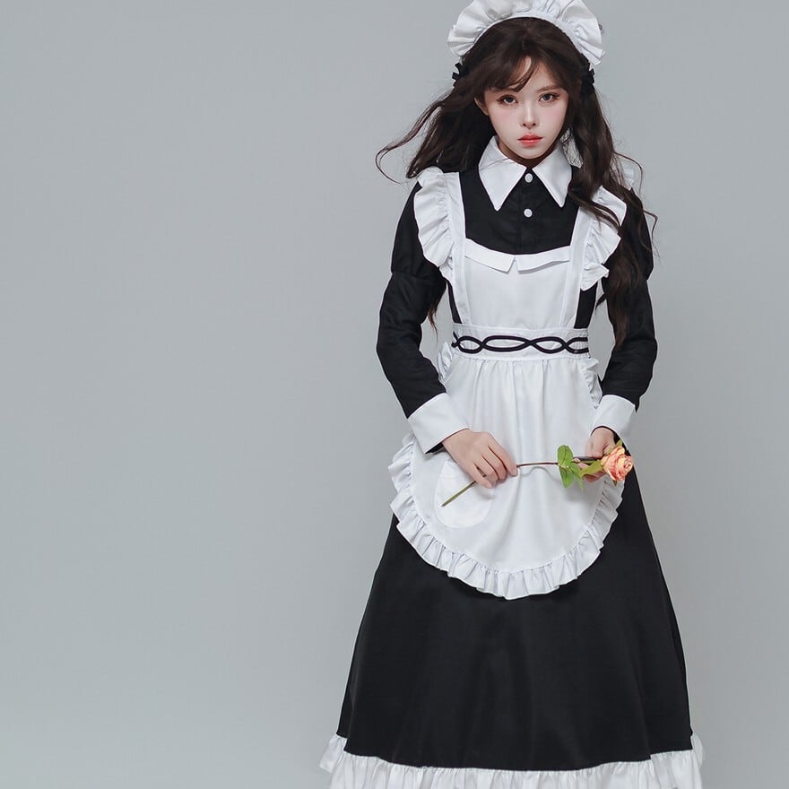 静かな佇まいの中に、整えられたフリルとモノトーンの対比が映えるロングメイドドレスです。長袖のワンピースに白エプロンとヘッドドレスを重ねることで、凛とした空気感が生まれます。落ち着いた存在感を求める場面で、しっかりと世界観を形にしたいときに選びたい一着です。