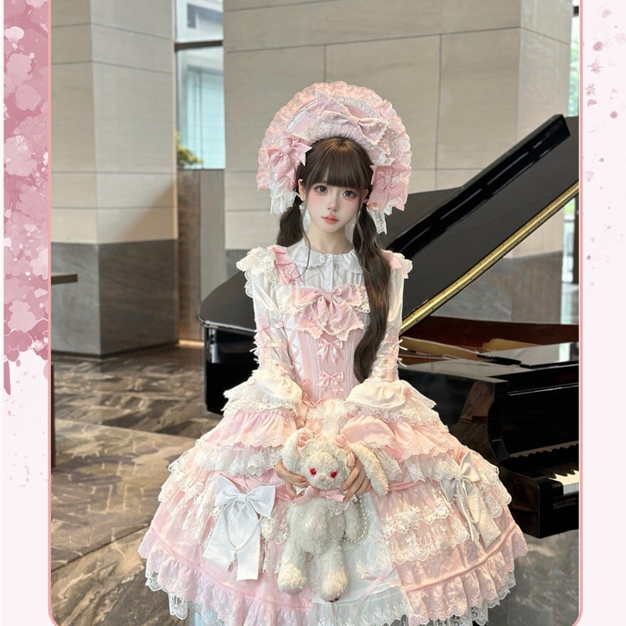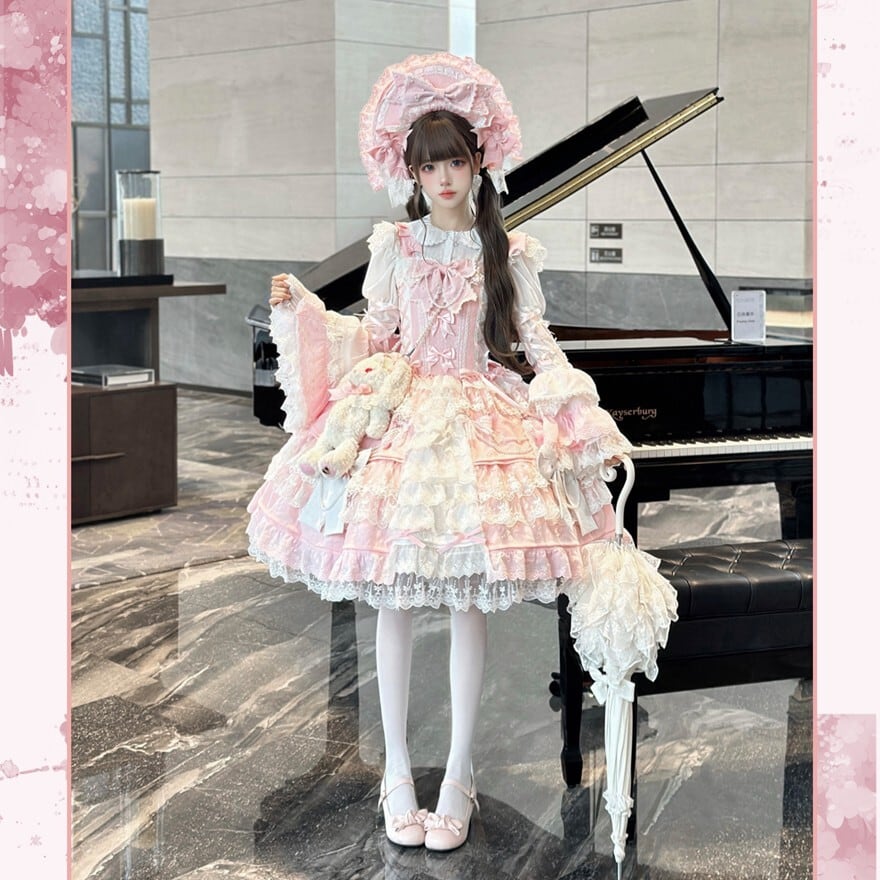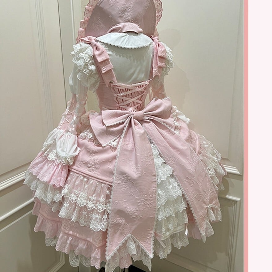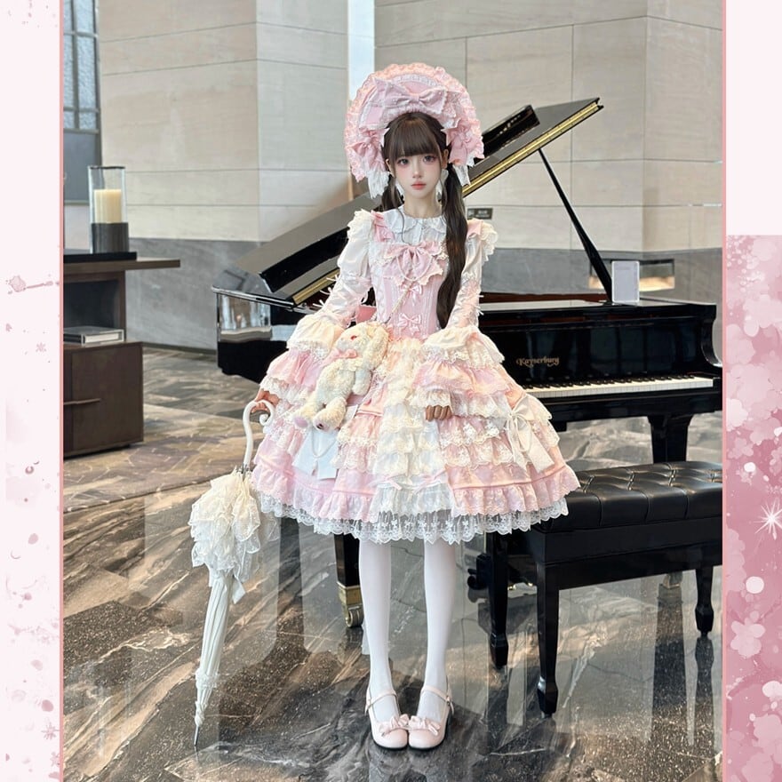 幾重にも重なるフリルと繊細なレースが、纏った瞬間に空気をやわらかく変えていく甘ロリJSKです。ボリューム感のあるスカートと背面の大きなリボンが印象的で、動きに合わせて揺れるシルエットが視線を引き寄せます。撮影会やお茶会など、世界観を大切にしたい場面で選びたくなる一着です。