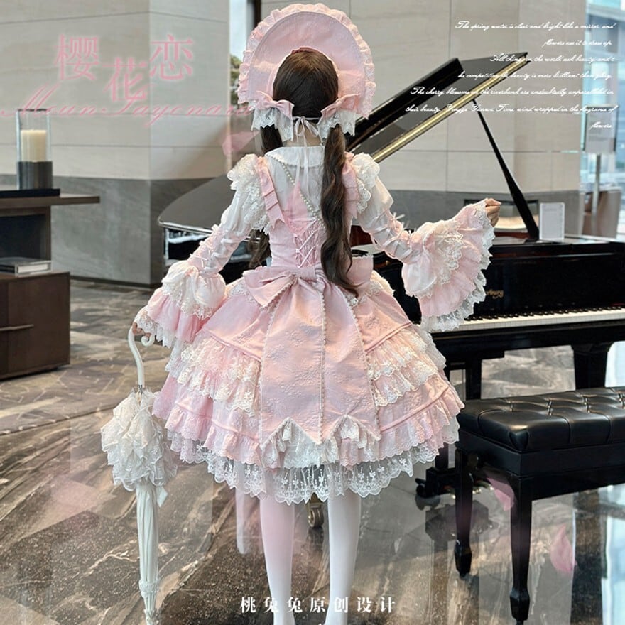 フリルとレースを重ねた甘ロリJSKにバックリボンを配したデザインで、撮影会やお茶会に映える3色展開の一着です。