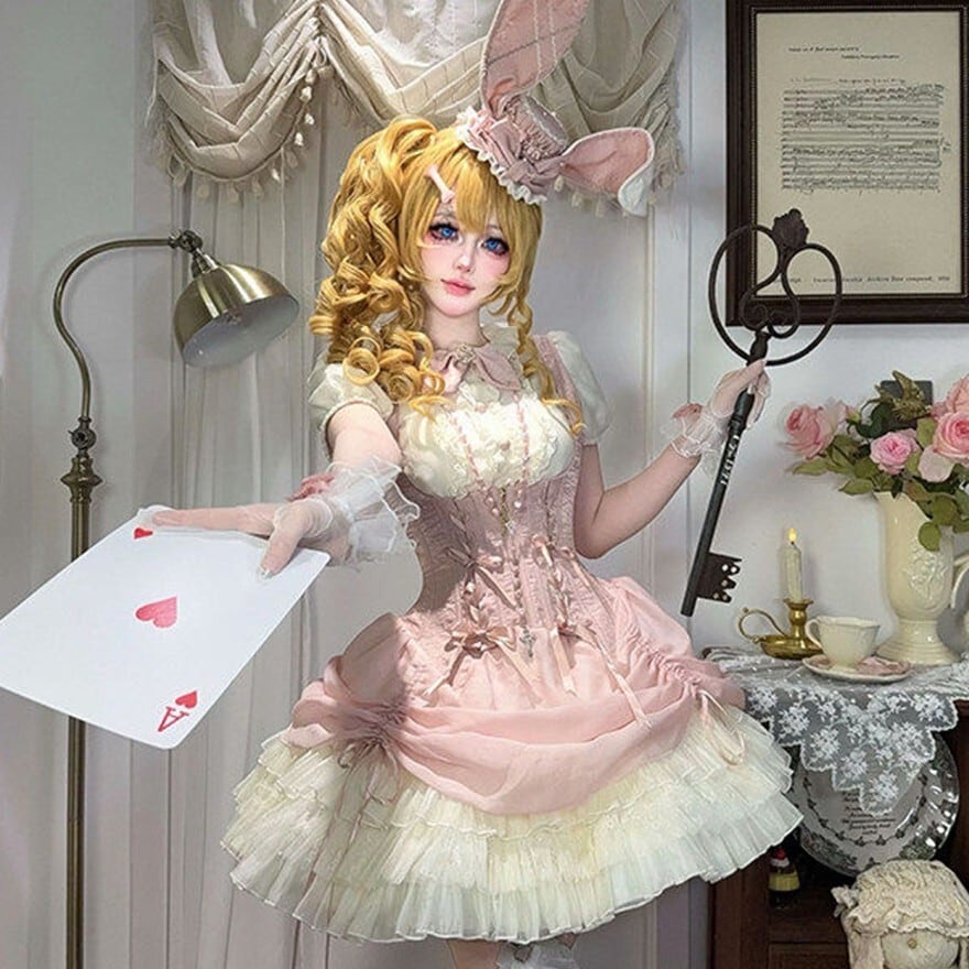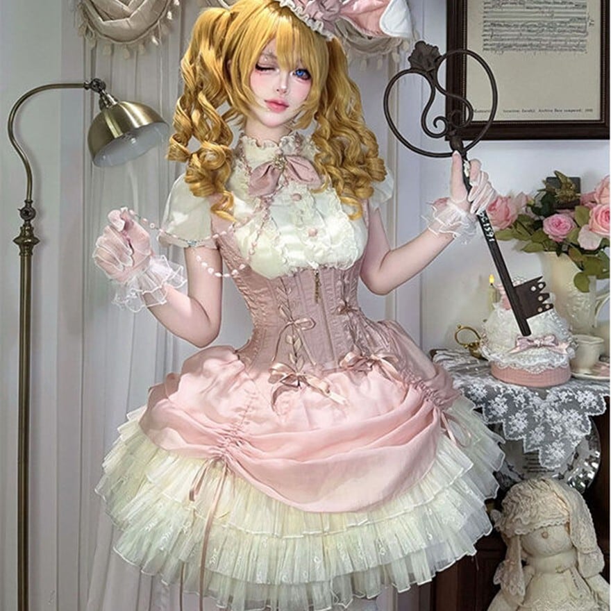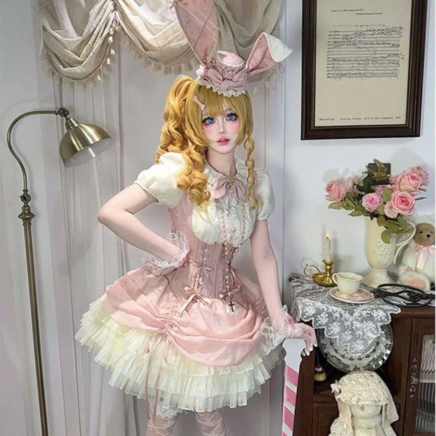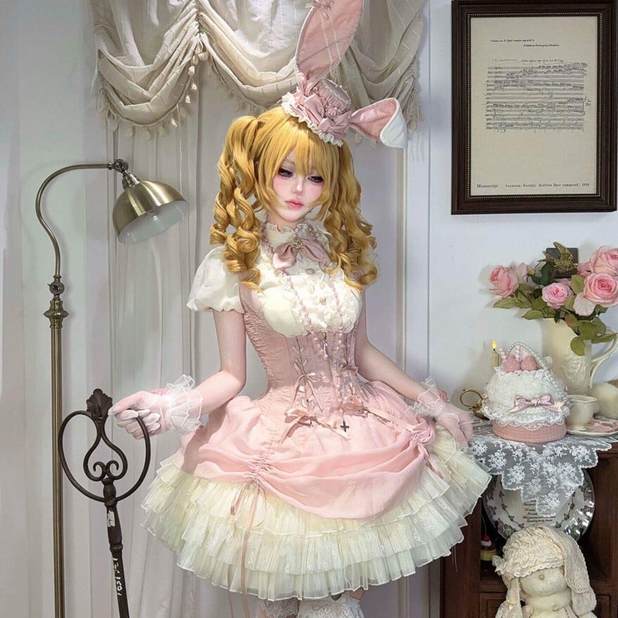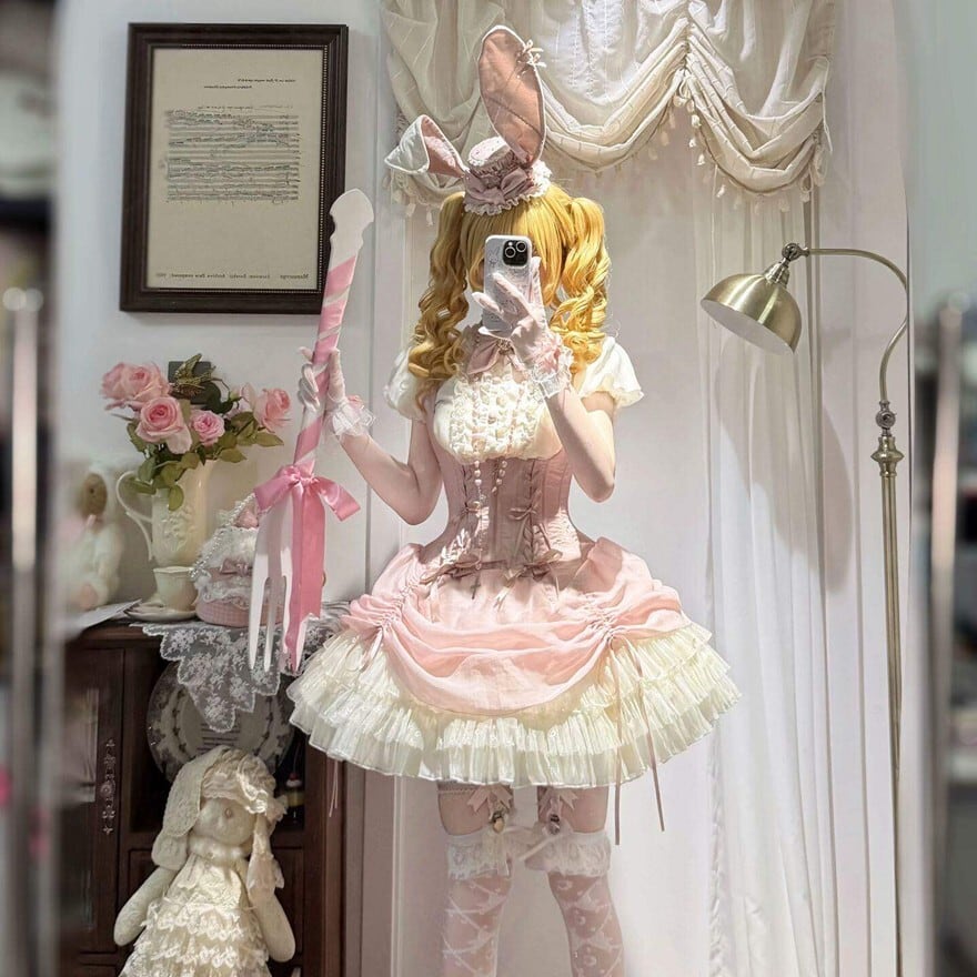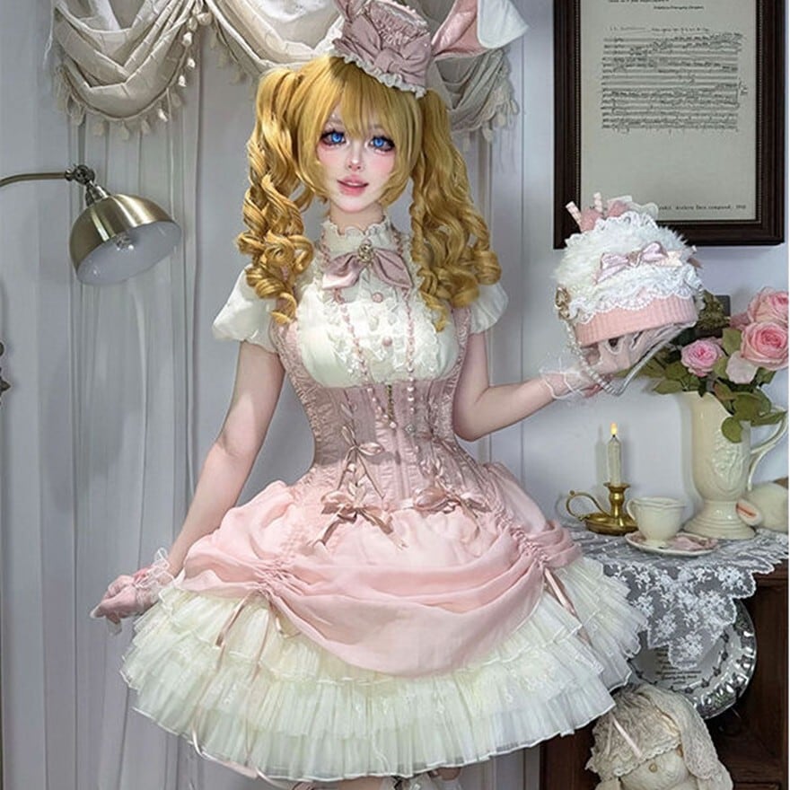 やわらかなピンクとフリルが幾重にも重なり、ひと目で物語が立ち上がるような佇まいのセットアップです。コルセット風のJSKにブラウスとリボンを重ねることで立体的なシルエットが生まれ、動くたびに軽やかな表情を見せます。ステージや撮影会など、視線を集める場面で印象を残すための一着です。