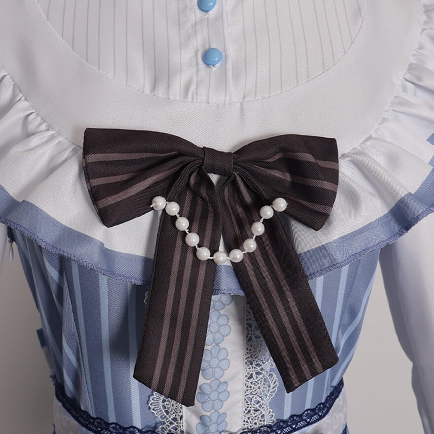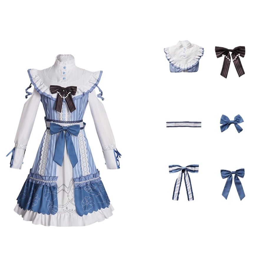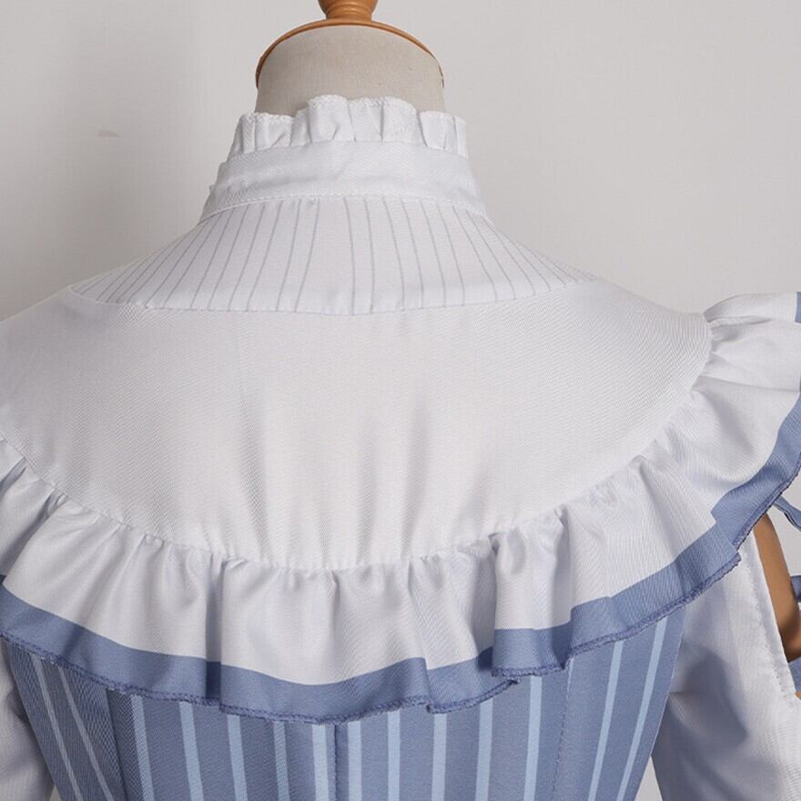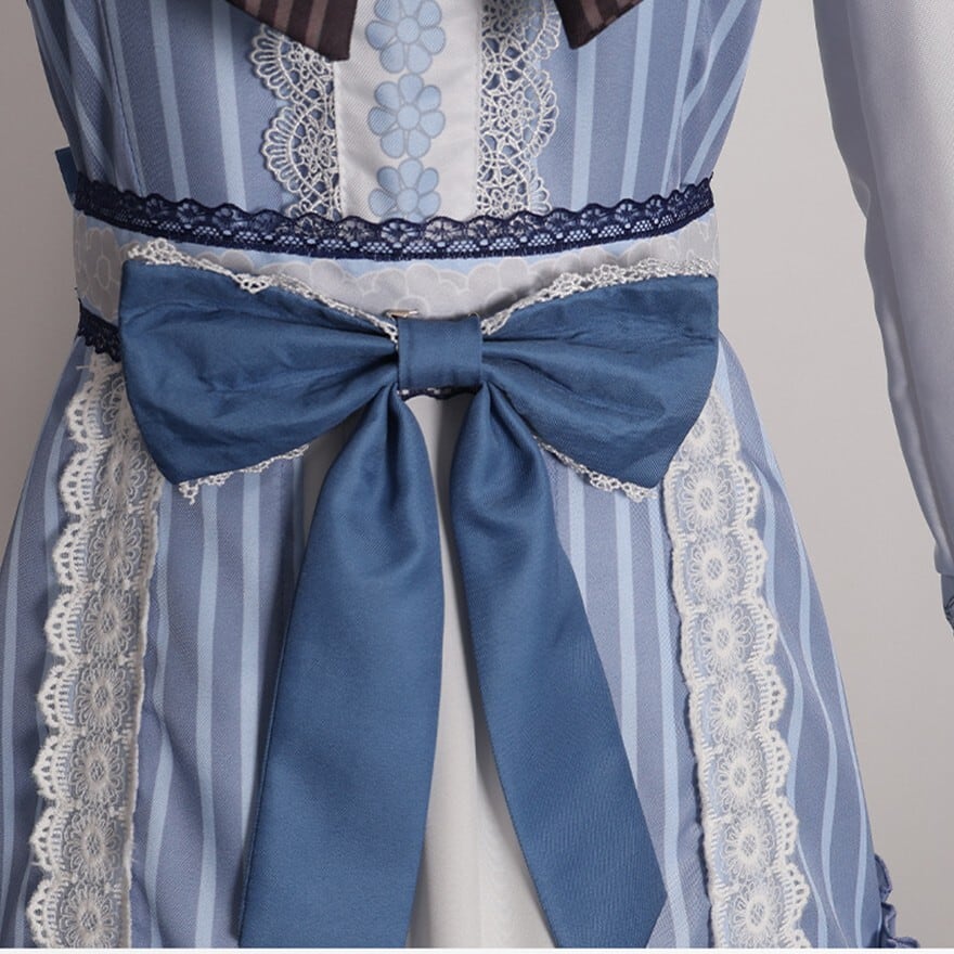澄んだ空気の中に凛とした気配を宿すクラシカルなメイド風ワンピースです。ブルーストライプと白のフリル、胸元とウエストのリボンが重なり、整った印象と柔らかな揺れを描きます。コンカフェや撮影の場で品のある存在感を纏いたいときに選びたい一着です。