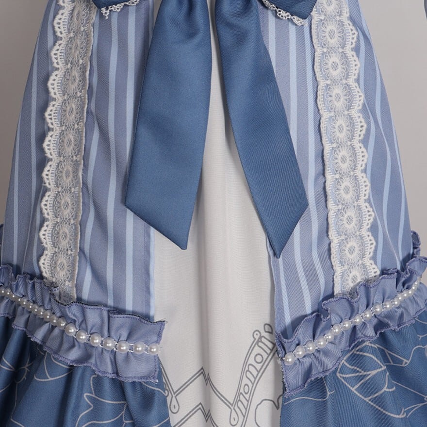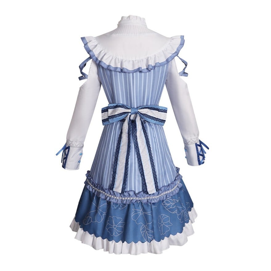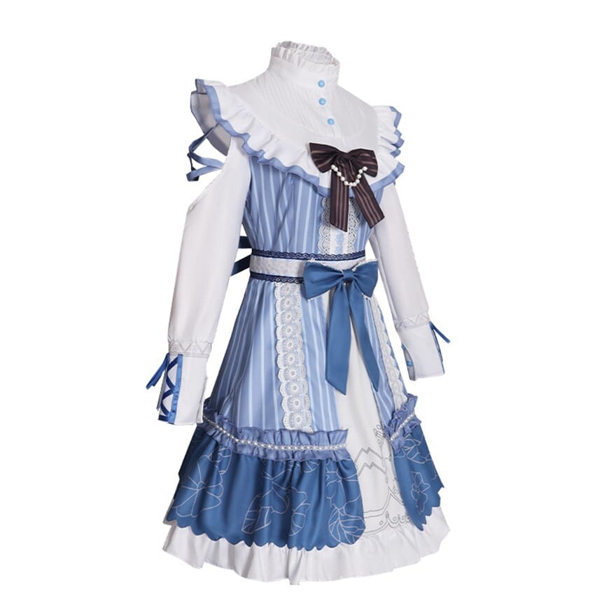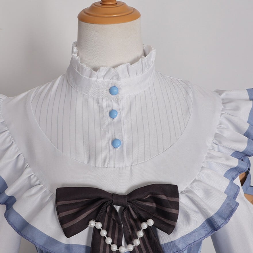 澄んだ空気の中に凛とした気配を宿すクラシカルなメイド風ワンピースです。ブルーストライプと白のフリル、胸元とウエストのリボンが重なり、整った印象と柔らかな揺れを描きます。コンカフェや撮影の場で品のある存在感を纏いたいときに選びたい一着です。