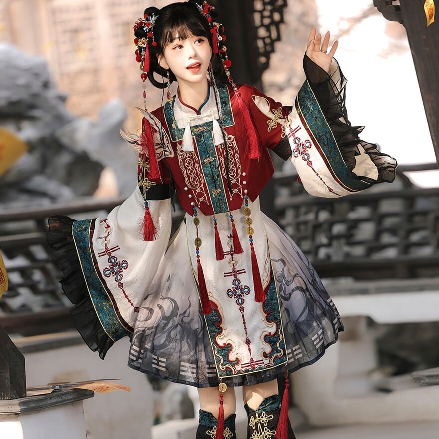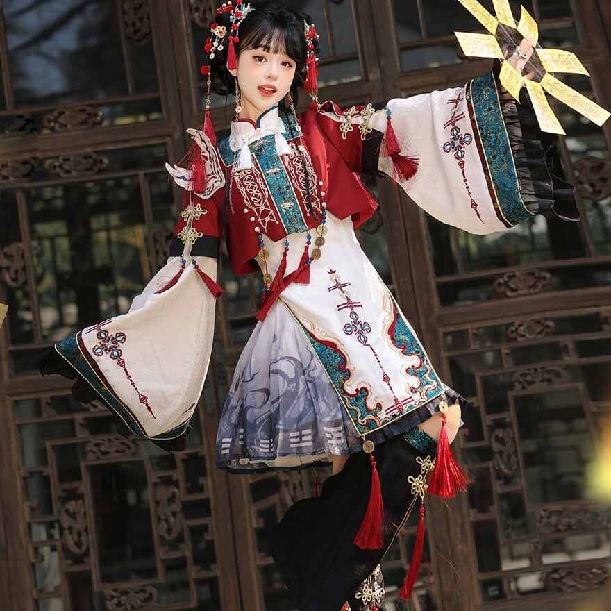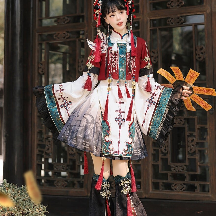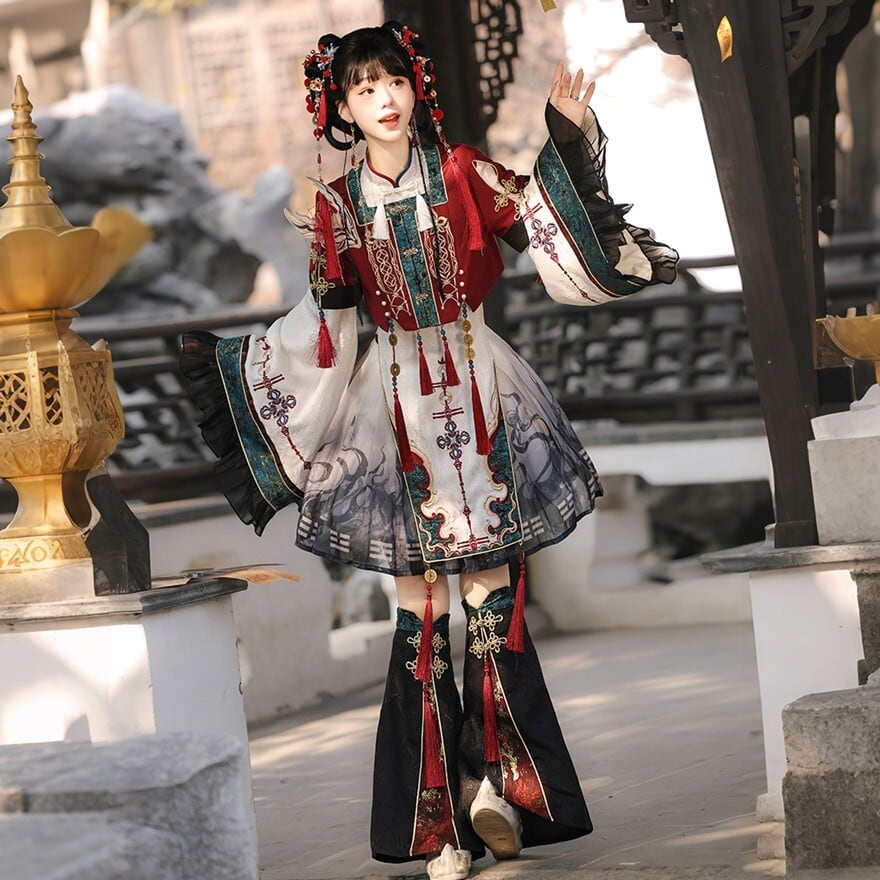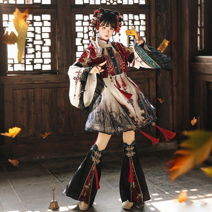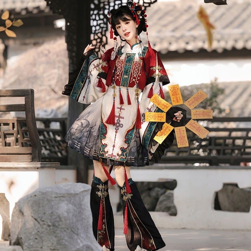刺繍入りトップスとショート丈羽織 スカート レッグカバーで構成された中華ロリータの漢服風4点セットで タッセル装飾と配色コントラストが特徴の撮影会やイベント向けをSEASONZ取り扱い。