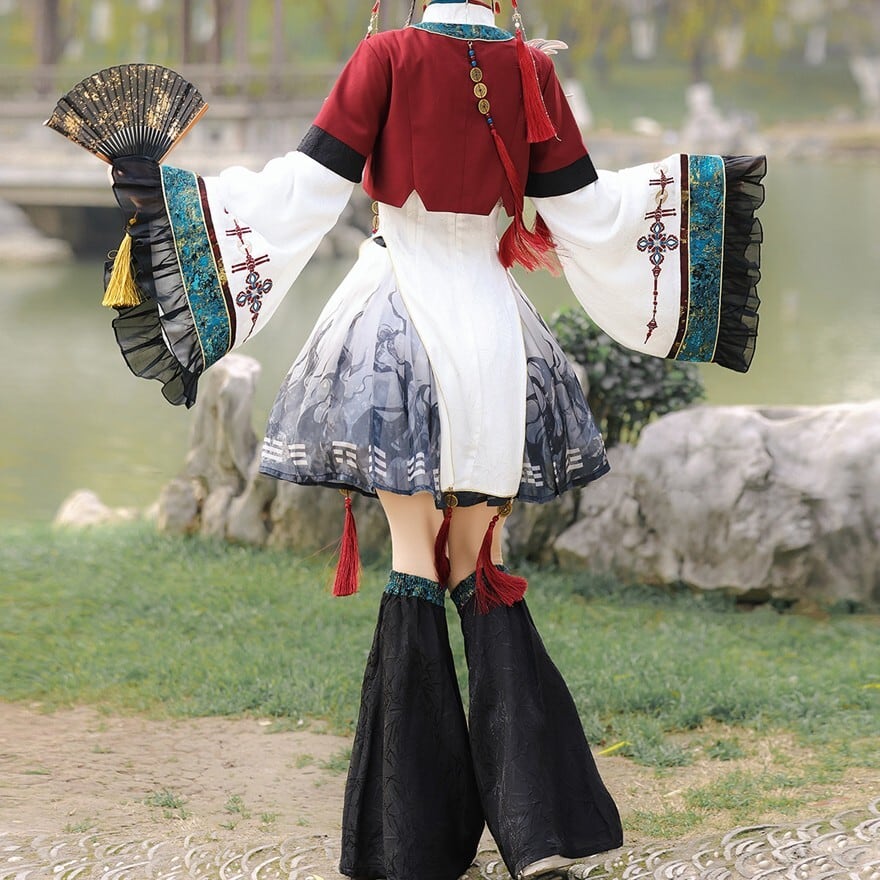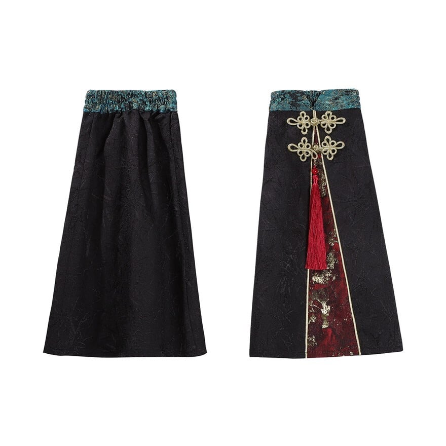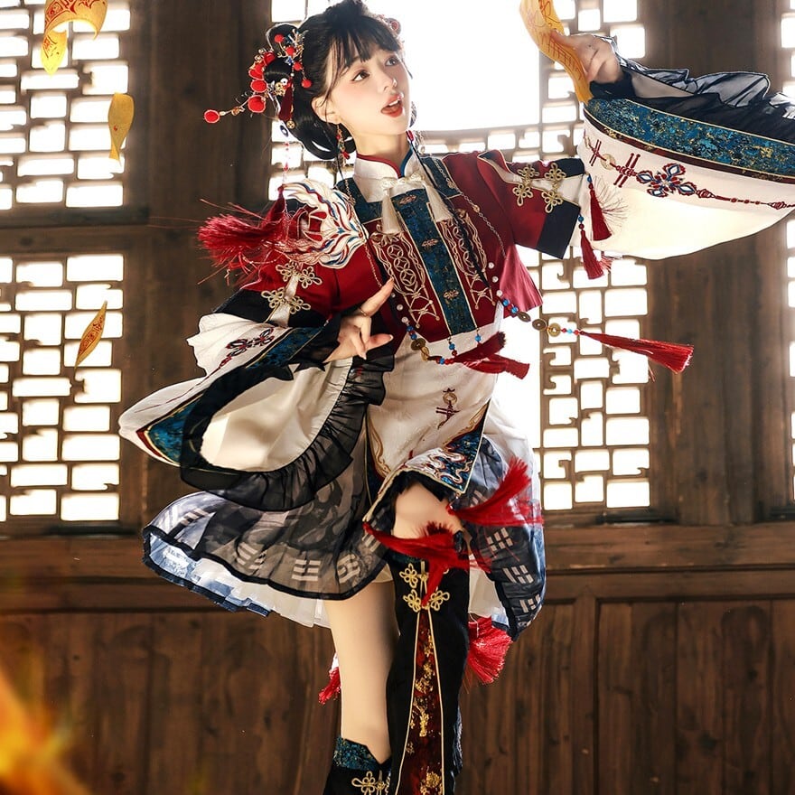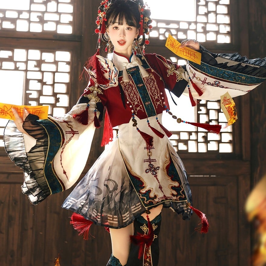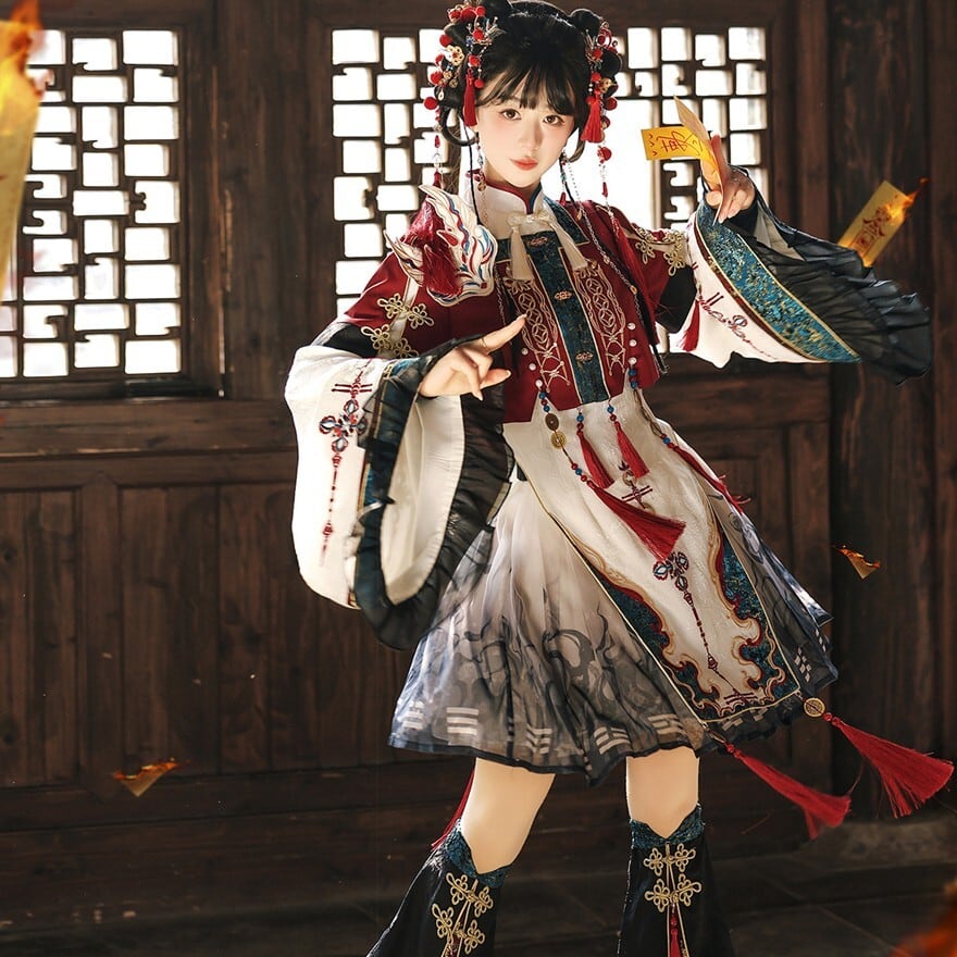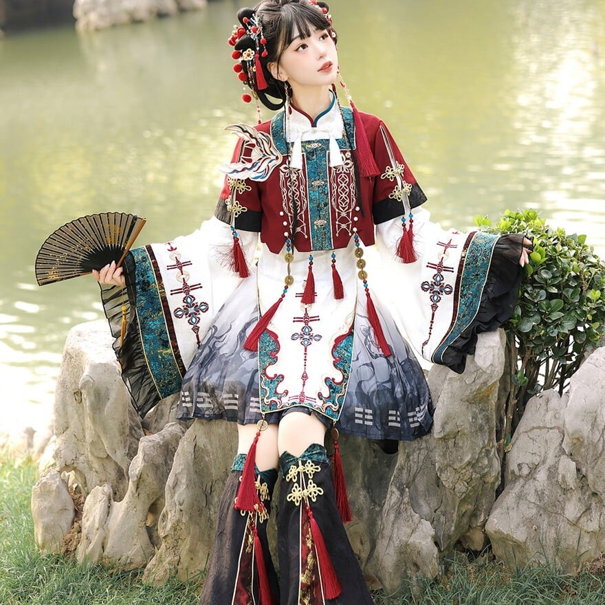 刺繍入りトップスとショート丈羽織 スカート レッグカバーで構成された中華ロリータの漢服風4点セットで タッセル装飾と配色コントラストが特徴の撮影会やイベント向けをSEASONZ取り扱い。