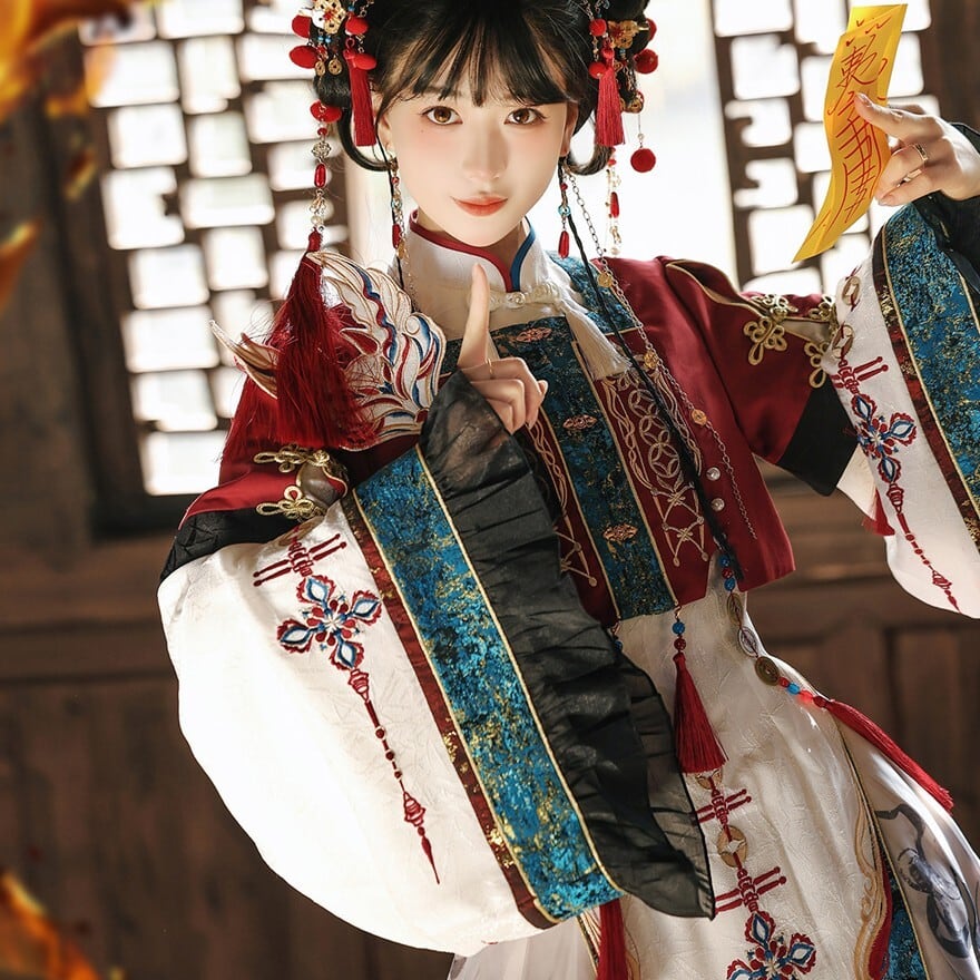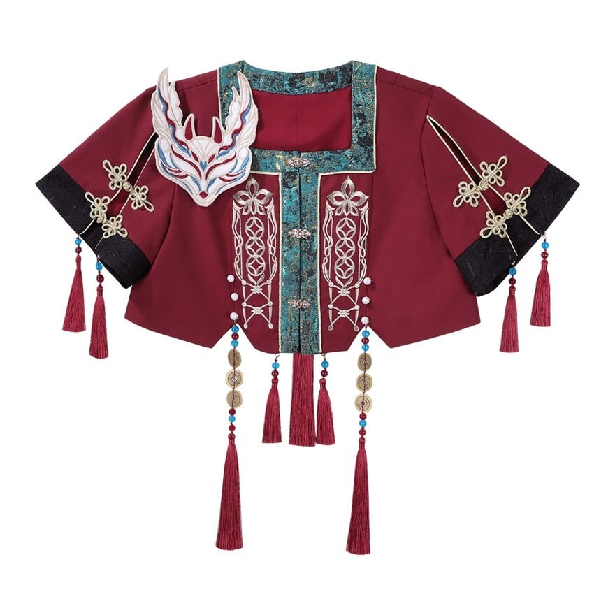 静けさの中に華やぎが差し込むような東洋の装飾美を纏う一着です。刺繍を施したトップスにショート丈の羽織 揺れるタッセルと柄入りスカートが重なり 視線を引き寄せる構成に仕上がっています。撮影やイベントで印象に残る存在感を求める場面に選びたいセットアップです。