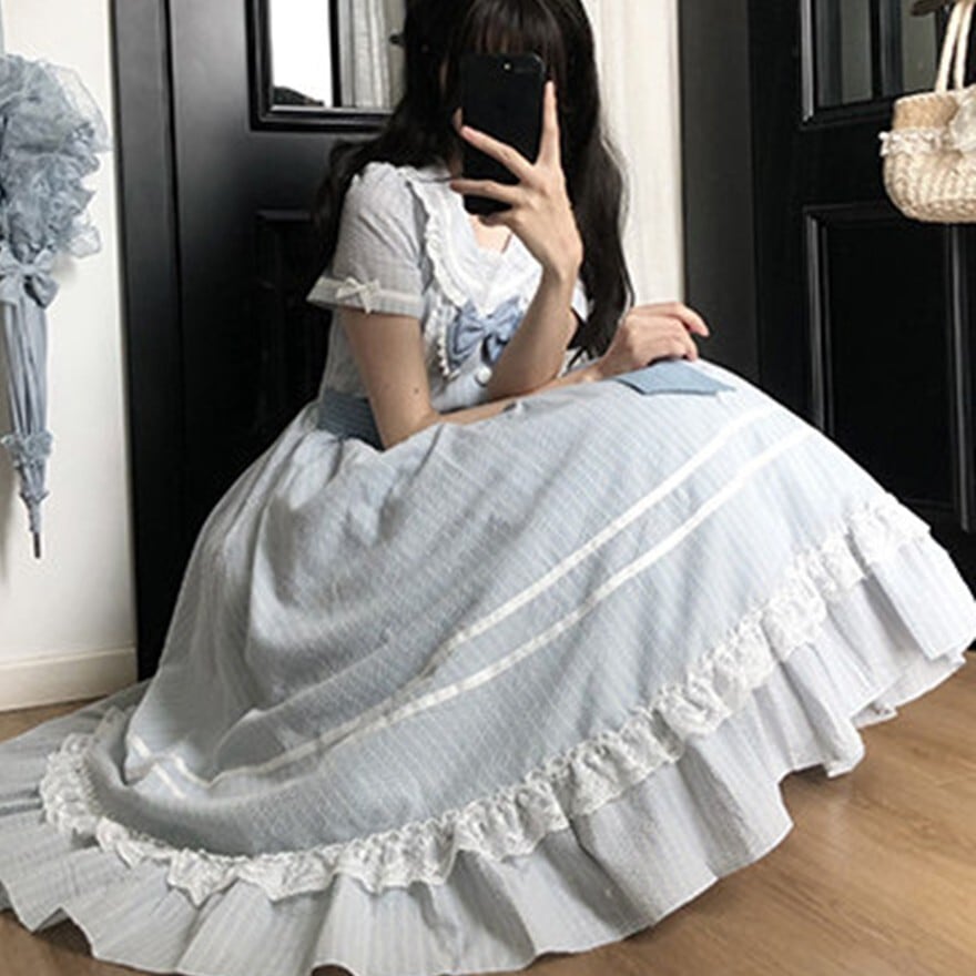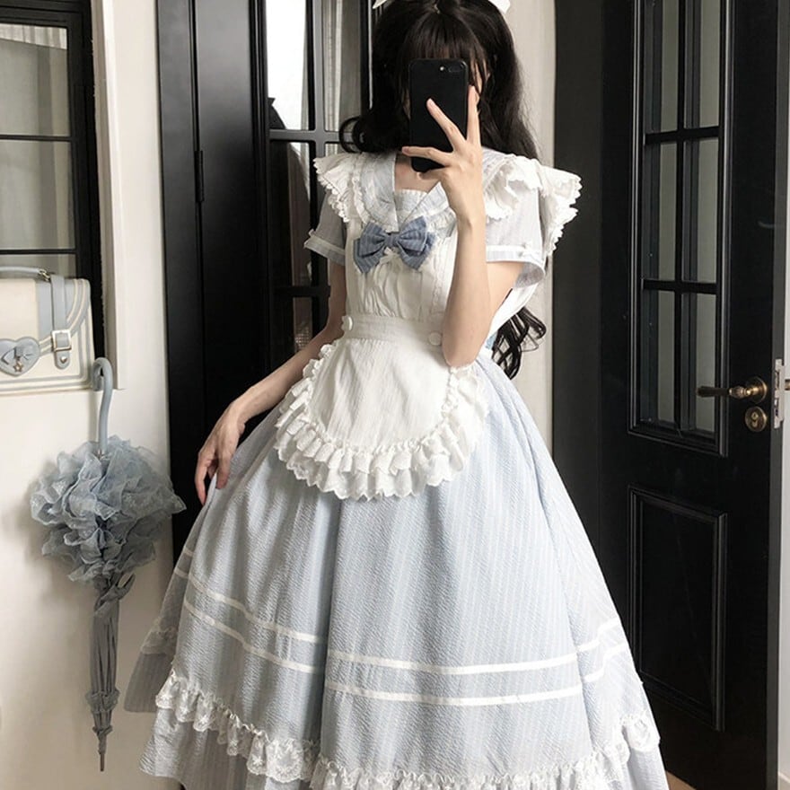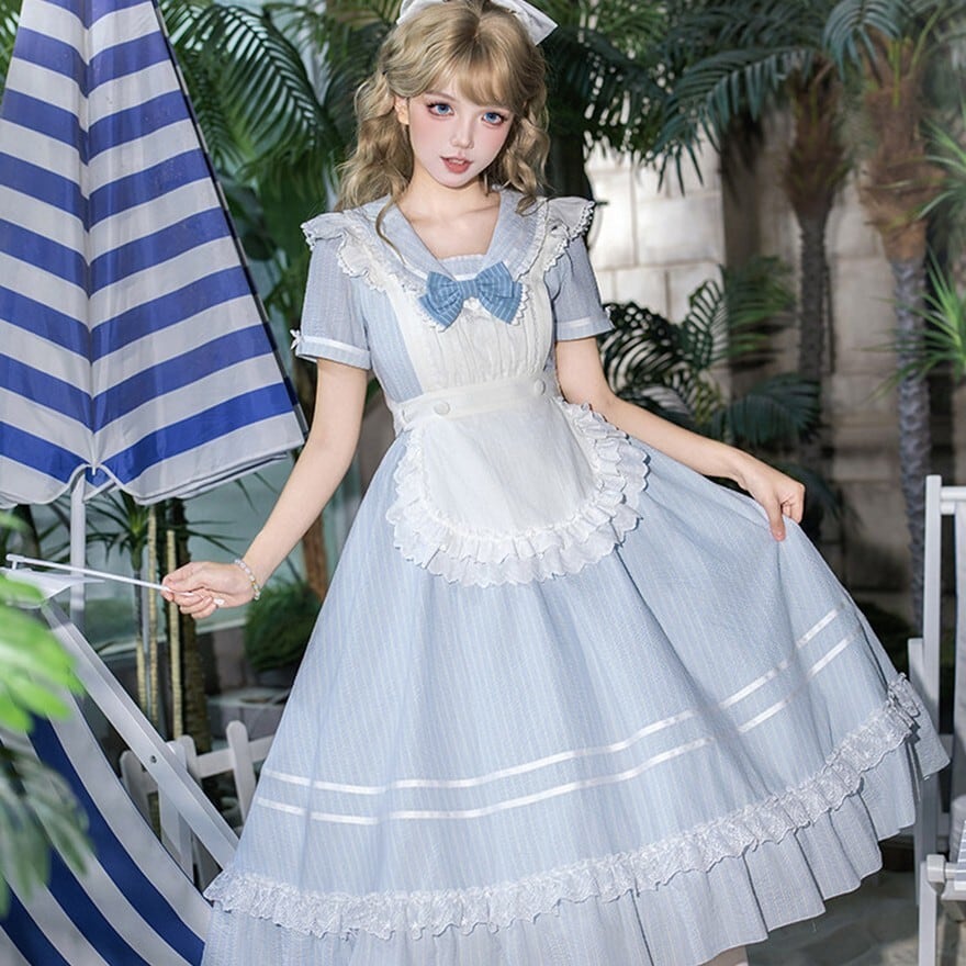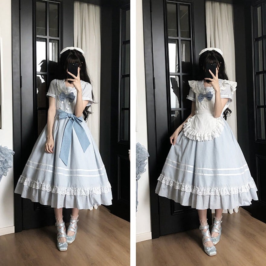 静かな庭園に差し込む淡い光のように、やわらかなブルーが印象に残るクラシカルメイドワンピースです。ロング丈の広がりにフリルエプロンとリボンが重なり、穏やかな気品をまとったシルエットを描きます。コンカフェや撮影の場で、静謐な存在感を保ちながら世界観を整える一着です。
