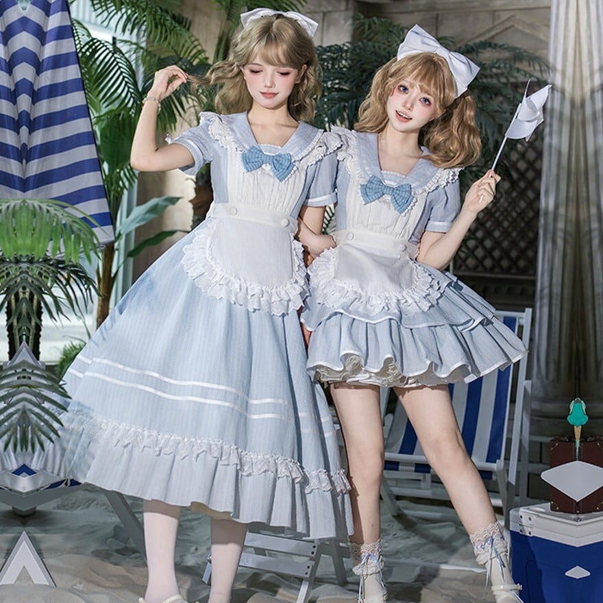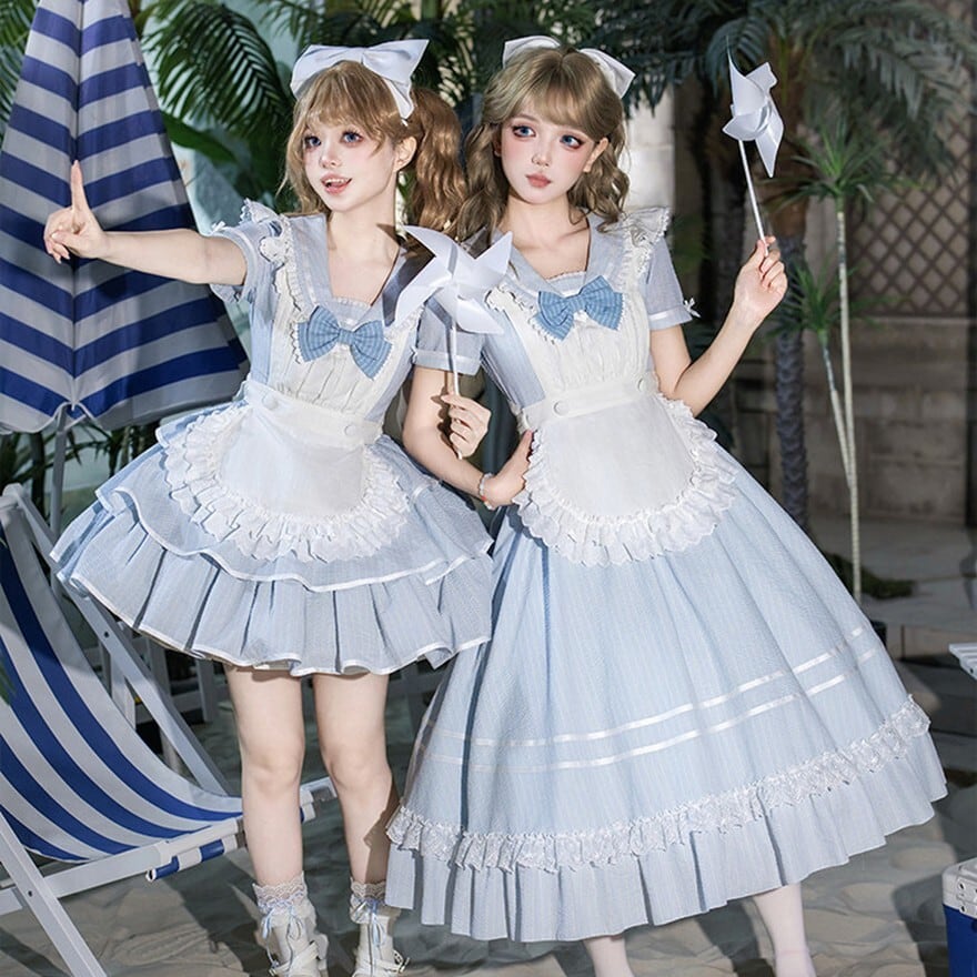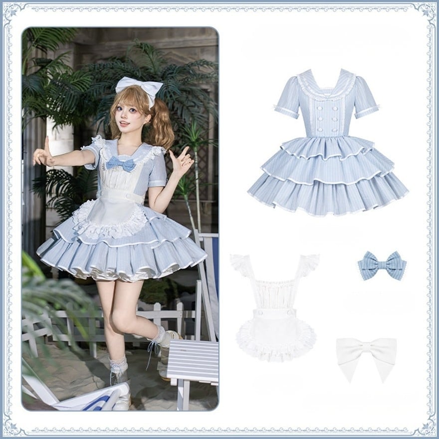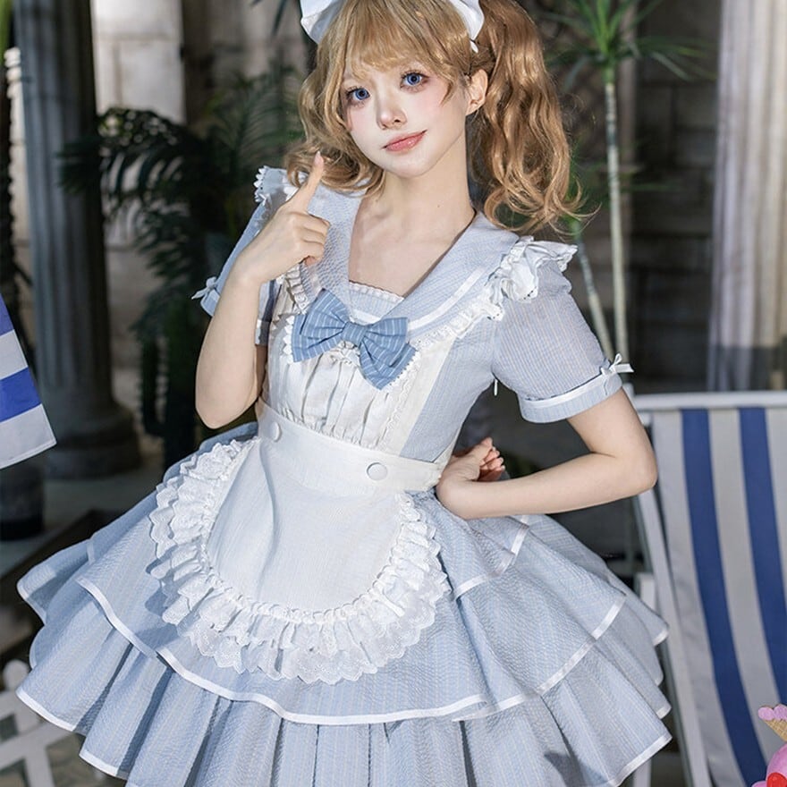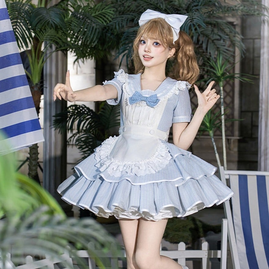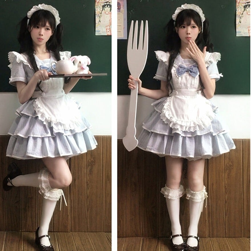 軽やかに広がるミニ丈のシルエットが、動きに合わせて空気を含むように揺れる一着です。淡いブルーに重なるフリルエプロンとリボンの重ねが、柔らかな印象と立体感を生み出します。コンカフェや撮影の場で、空間を明るく引き上げる存在として選ばれる構成です。