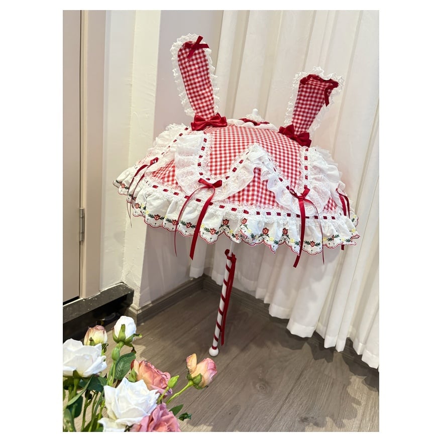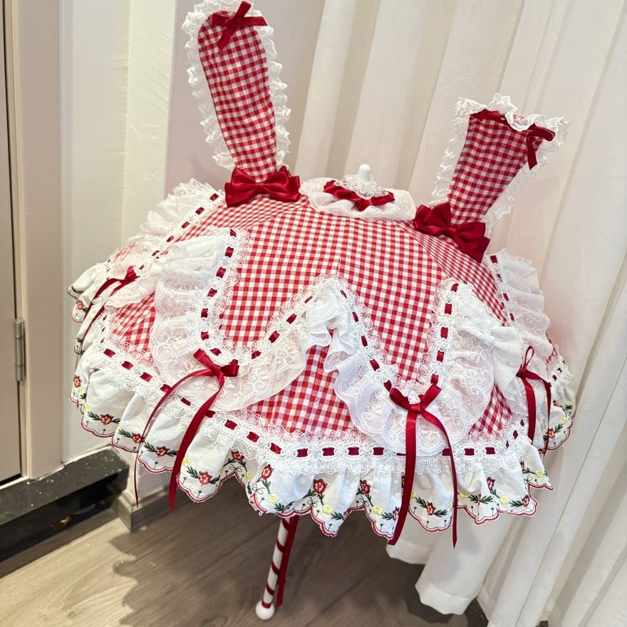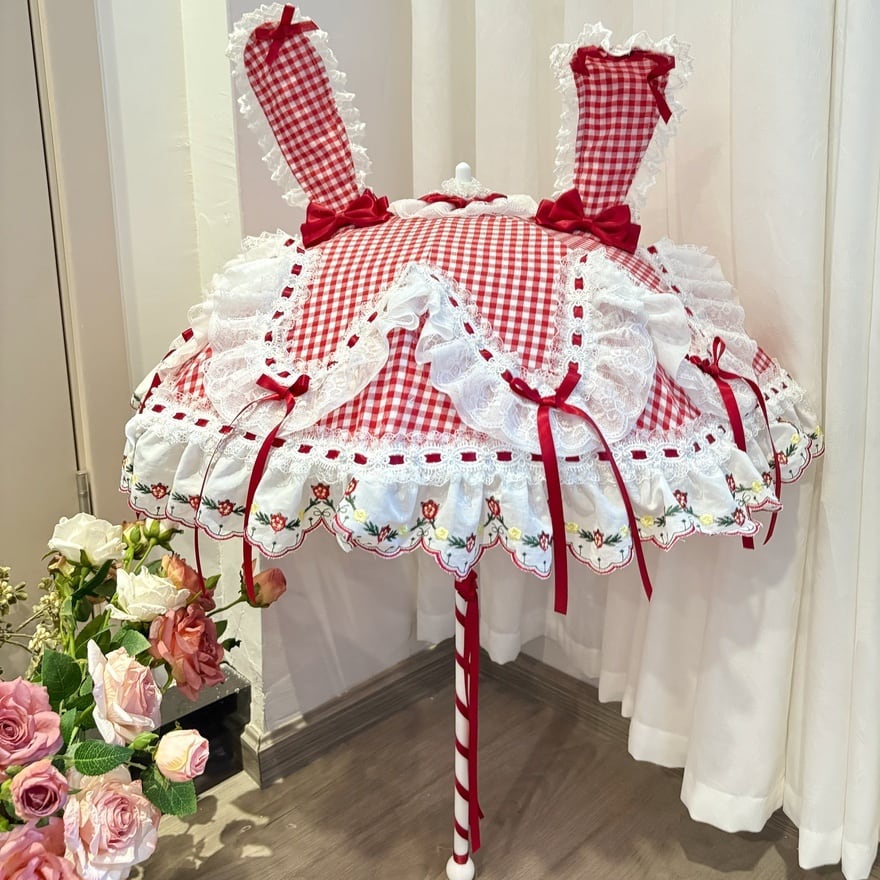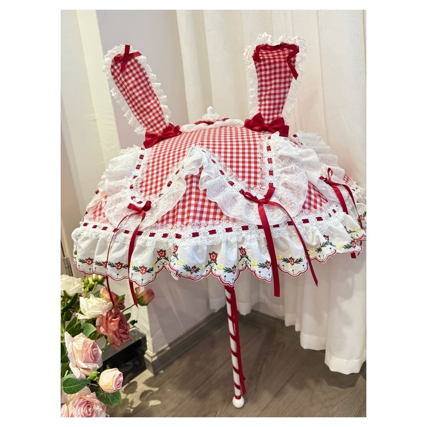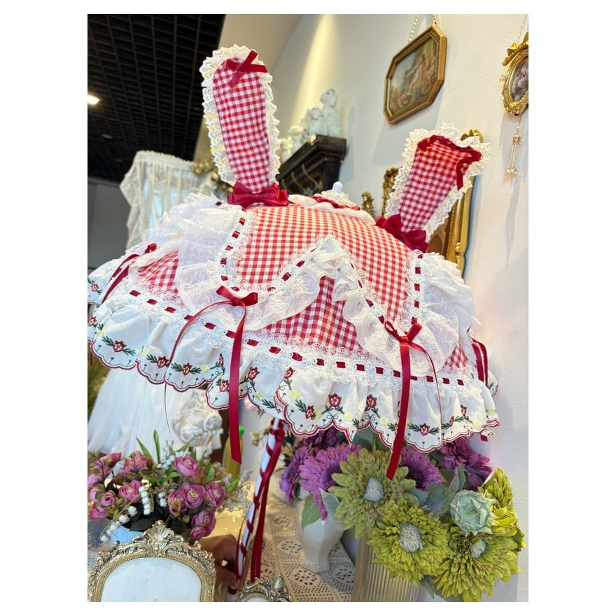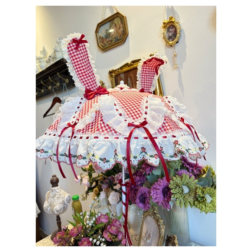 差した瞬間、装い全体が物語の中へ入っていくような甘ロリ系の日傘です。赤ギンガムに白レースを重ね、うさ耳や細リボン、いちご刺繍まで丁寧に重ねたデザインは、可愛いをまっすぐ楽しみたい日にぴったり。日差しをよけるための小物でありながら、コーデの主役として映える一本です。