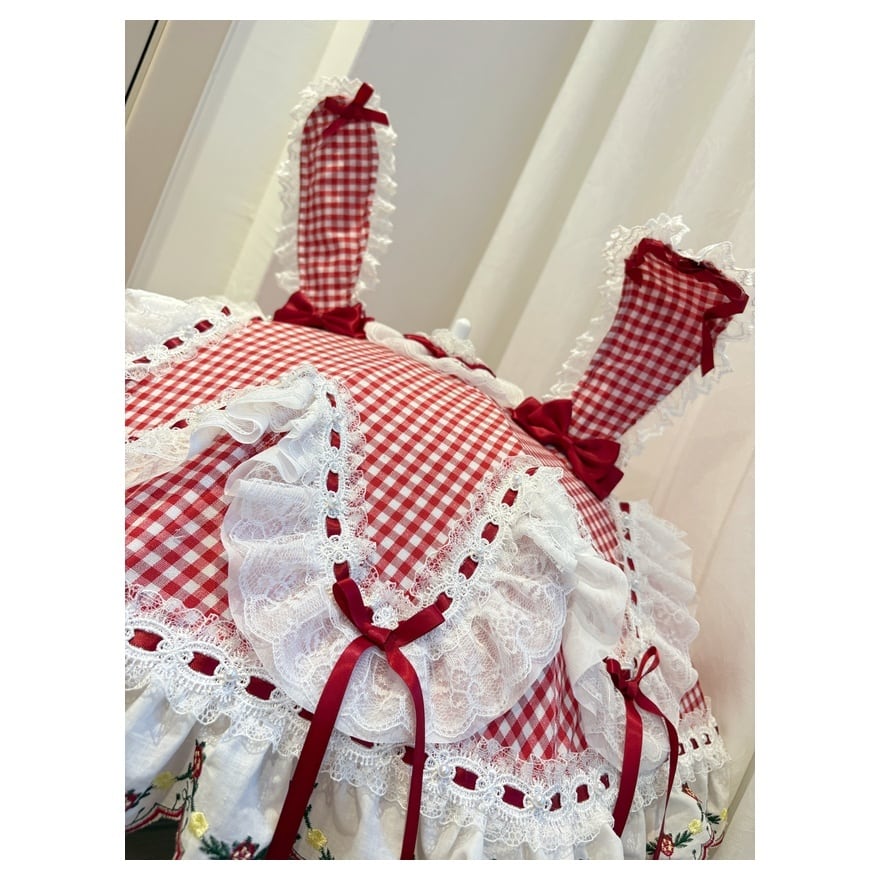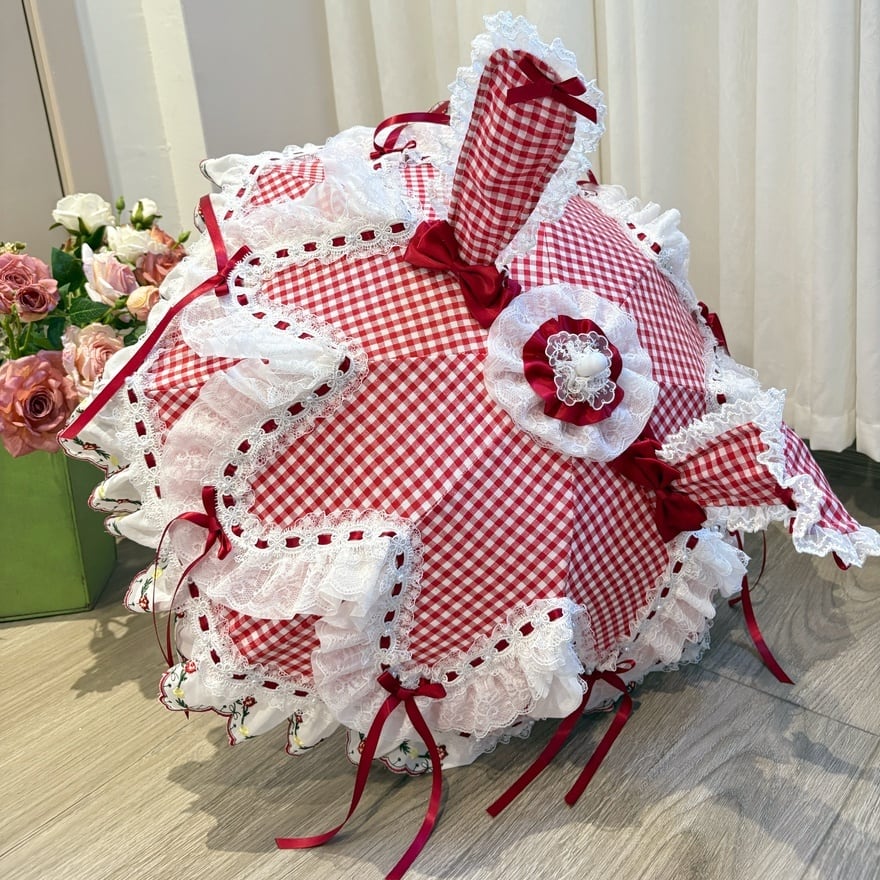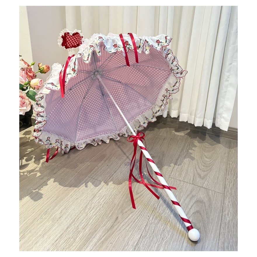 傘面:レッド×ホワイトのギンガムチェックを主役にし、裾へ白レースと刺繍入りフリルを重ねた華やかな仕上がりです。