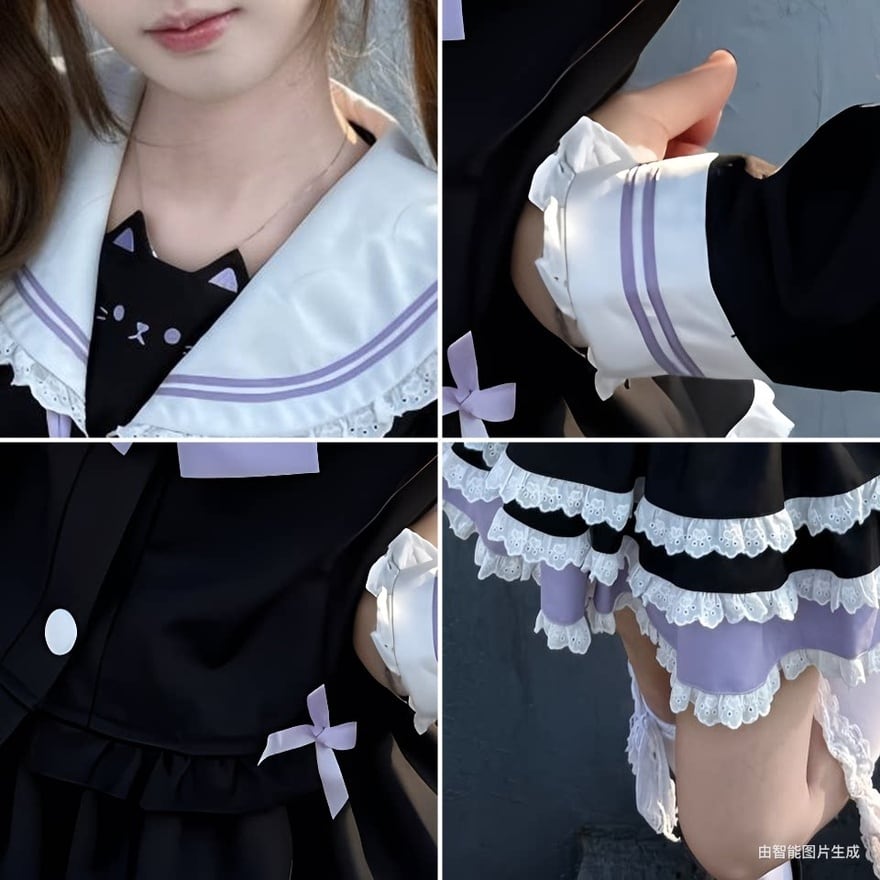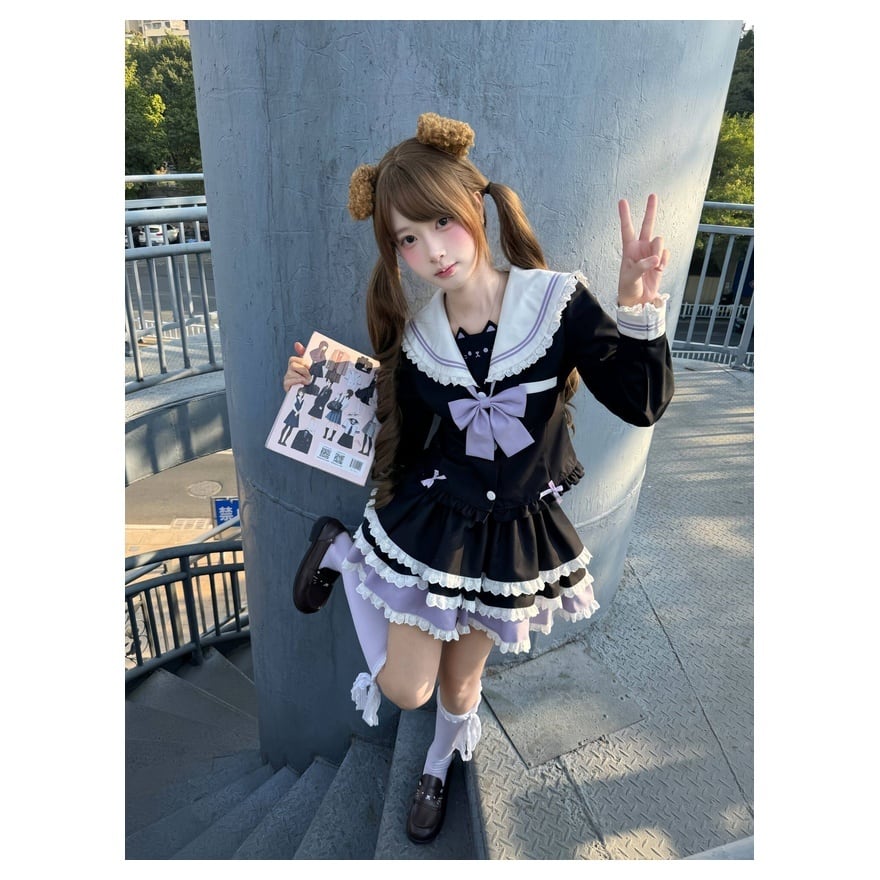 甘さをしっかり残しながら、制服風のきちんと感も楽しめる量産型の上下セットです。ブラックを基調に、ホワイトレースとラベンダーの差し色を重ねることで、可憐さの中へ少し落ち着いた印象も添えています。ツインテールやリボン小物とも相性が良く、撮影会やイベントで映える一着です。