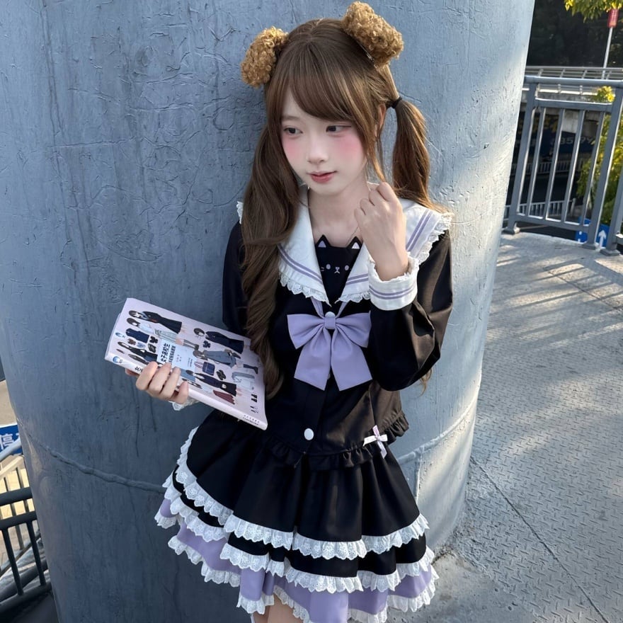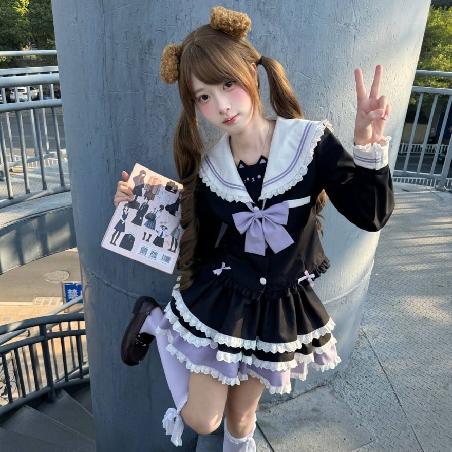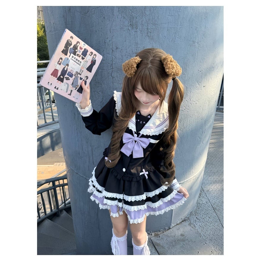 セーラーカラーには、少女らしい軽やかさと少しだけ特別な日を思わせる空気があります。そこへ段フリルのスカートとラベンダーリボンを重ねることで、このセットは甘いだけでは終わらない、きちんと整えられた可愛さをつくります。制服風の印象を残しながら、量産型らしい華やぎをしっかり楽しめる装いです。