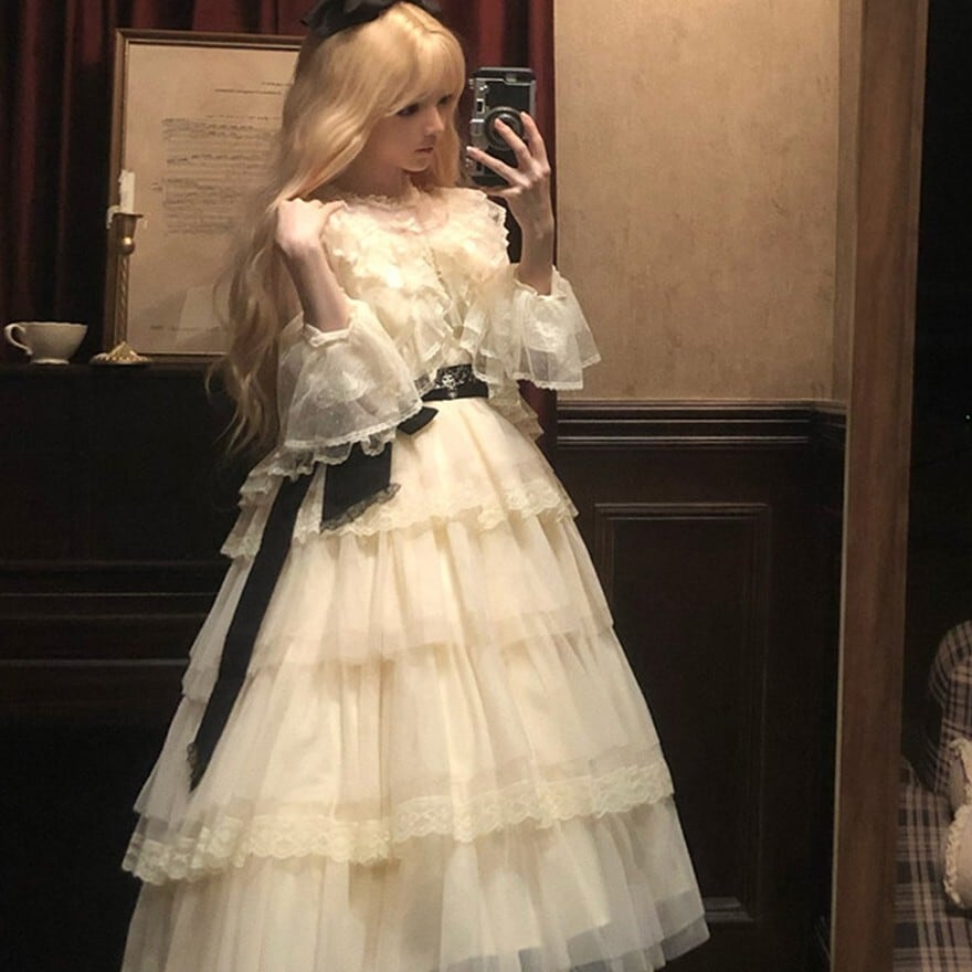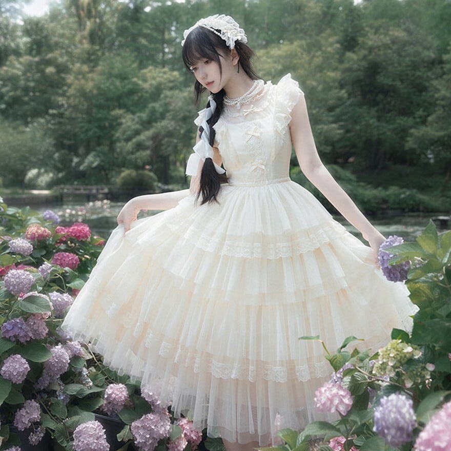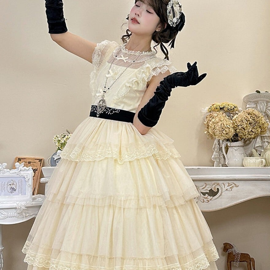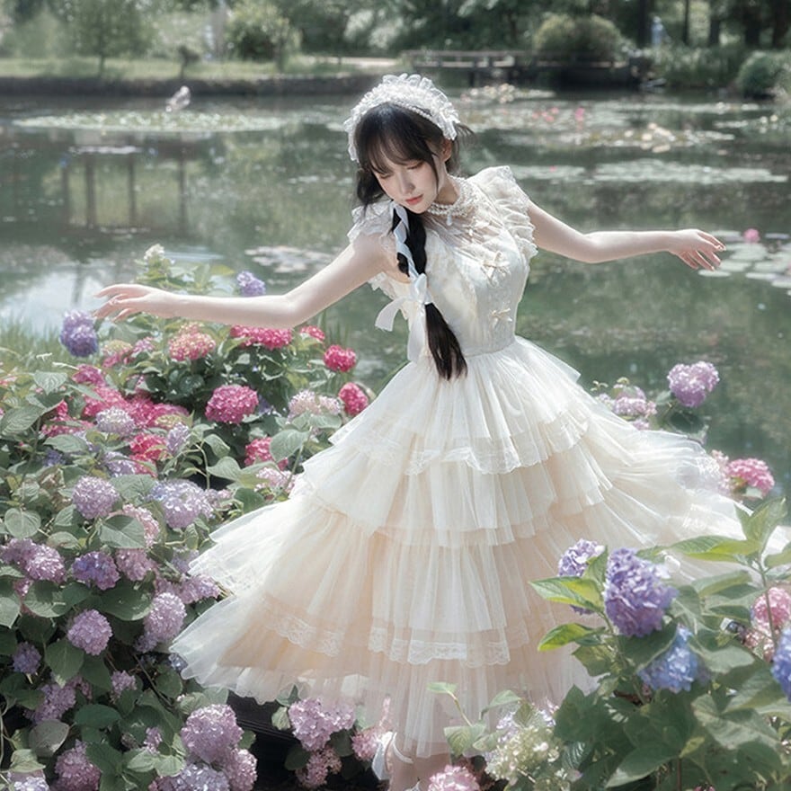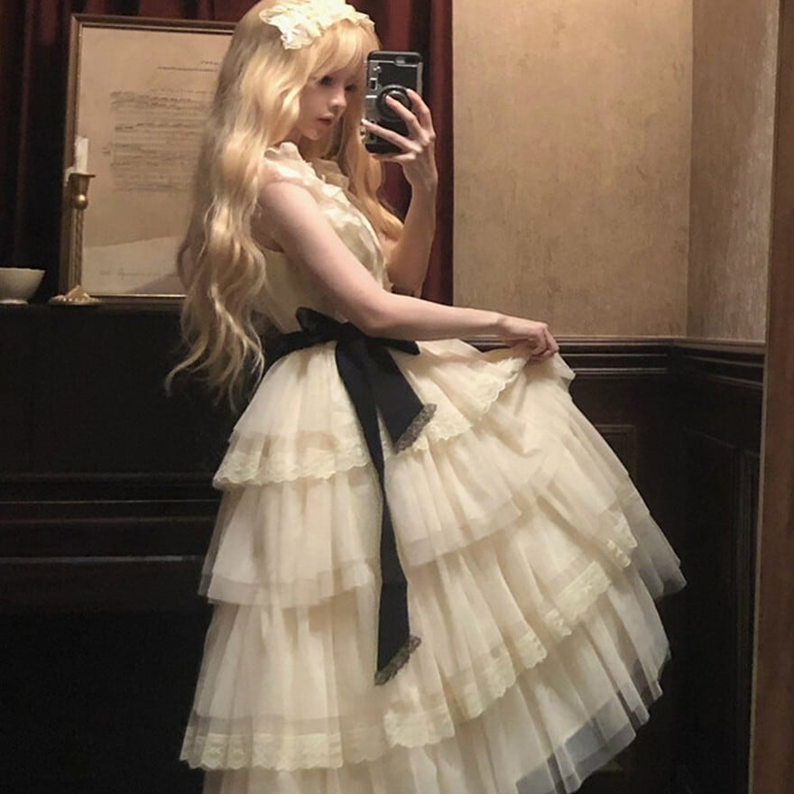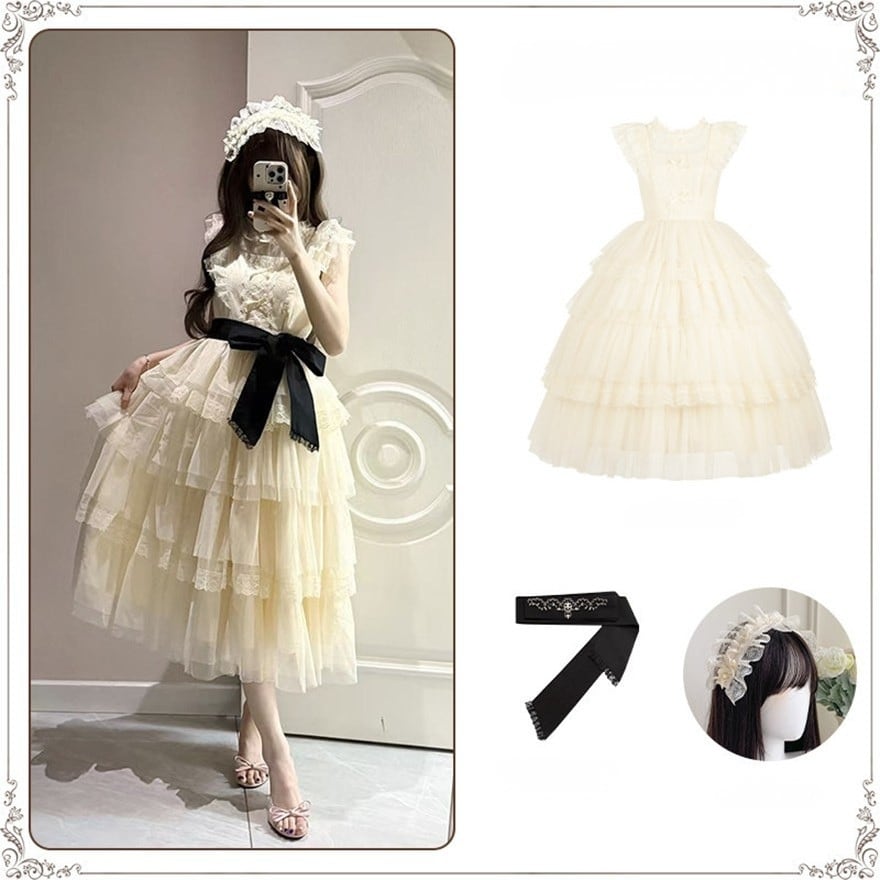 やわらかな光を纏うような淡い色合いと、重なり合うフリルのリズム。そこに黒のリボンが差し込まれることで、甘さだけに寄らない静かな均衡が生まれ、穏やかな物語の一場面のような佇まいへと導きます。