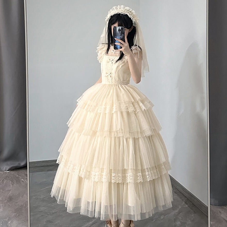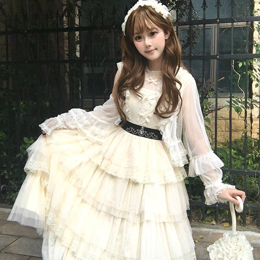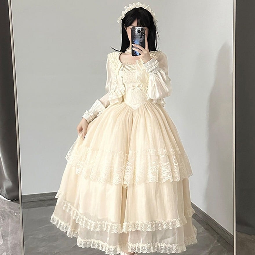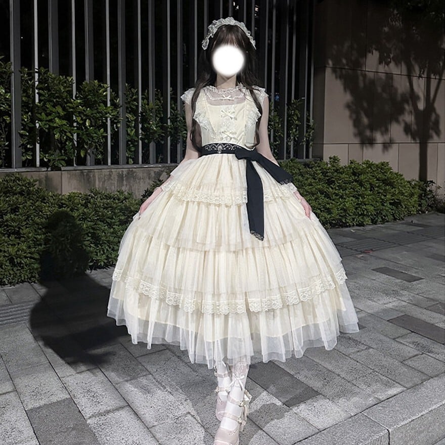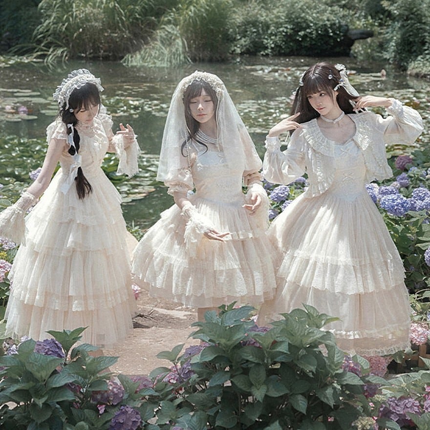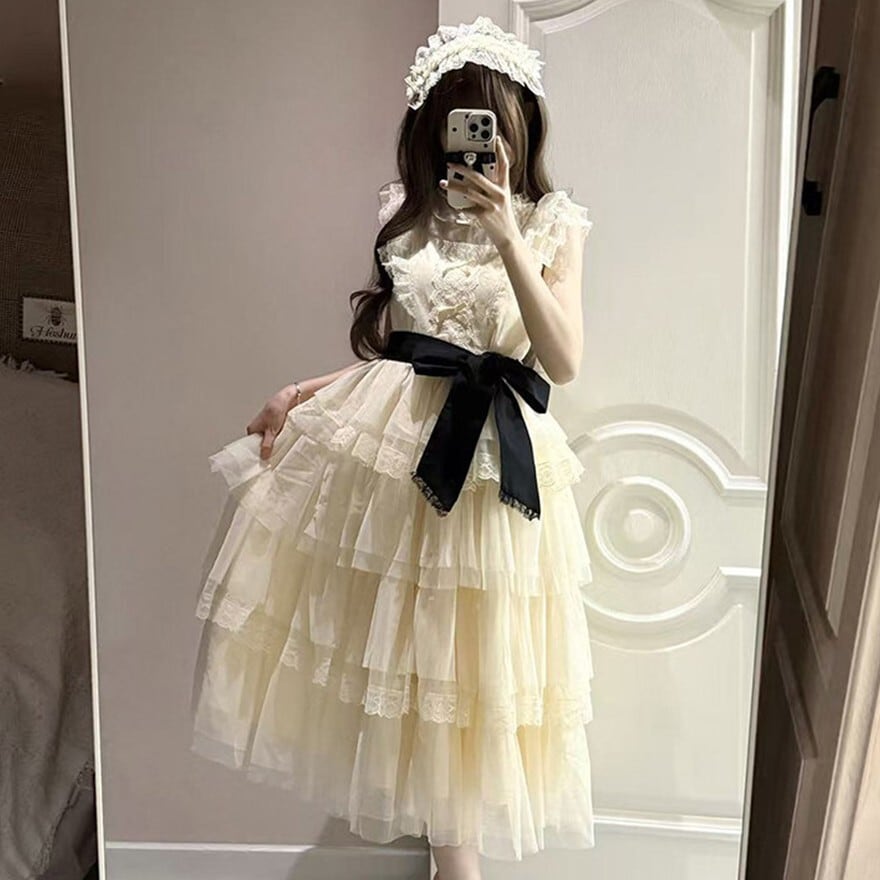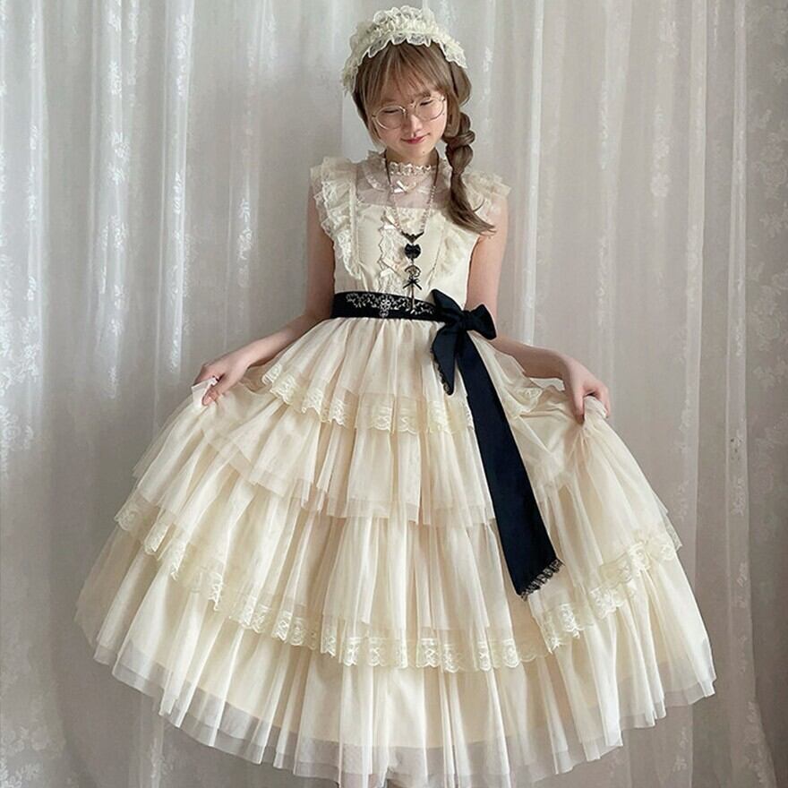 やわらかな光を纏うような淡い色合いと、重なり合うフリルのリズム。そこに黒のリボンが差し込まれることで、甘さだけに寄らない静かな均衡が生まれ、穏やかな物語の一場面のような佇まいへと導きます。