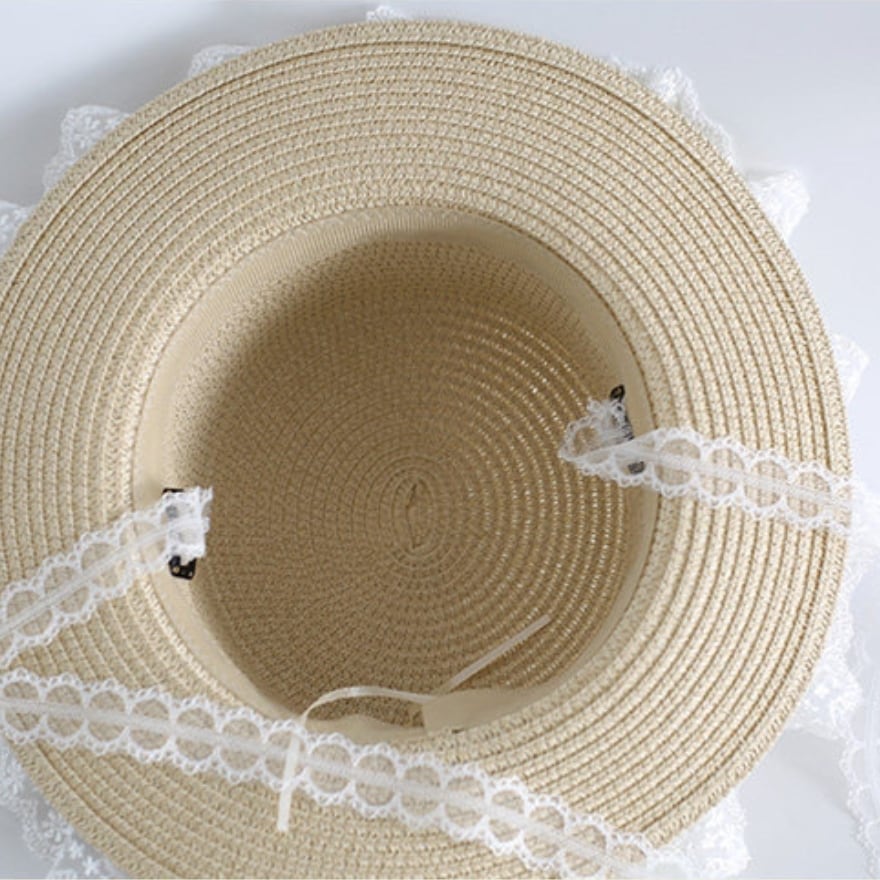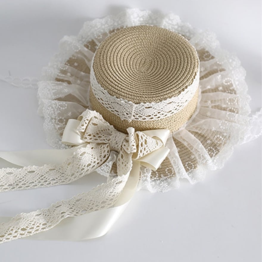繊細なレースフリルをぐるりとあしらった、可憐な印象の麦わらカンカン帽です。