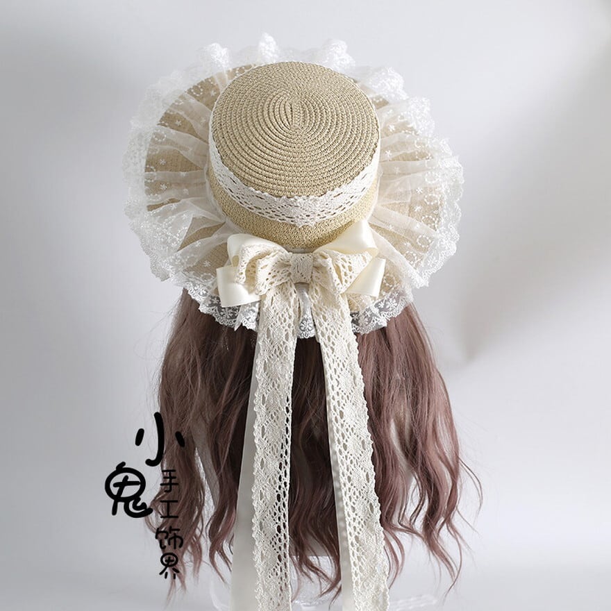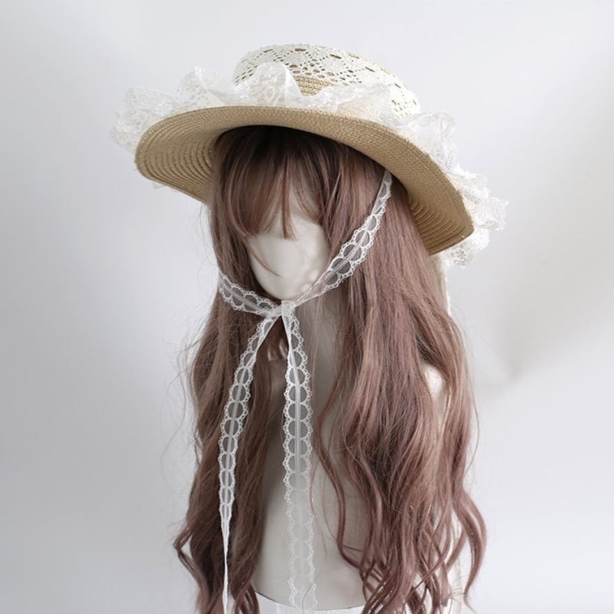 ロリータ 麦わらカンカン帽 レースフリル リボン付き ストローハット 夏小物 58cm|SEASONZ